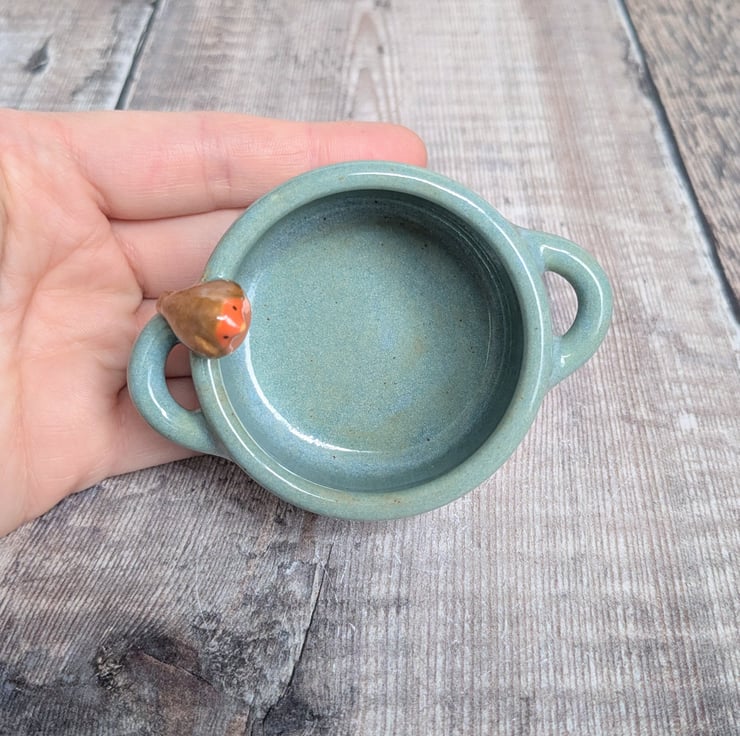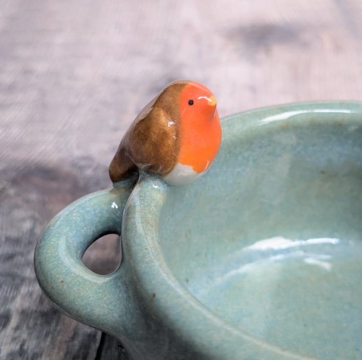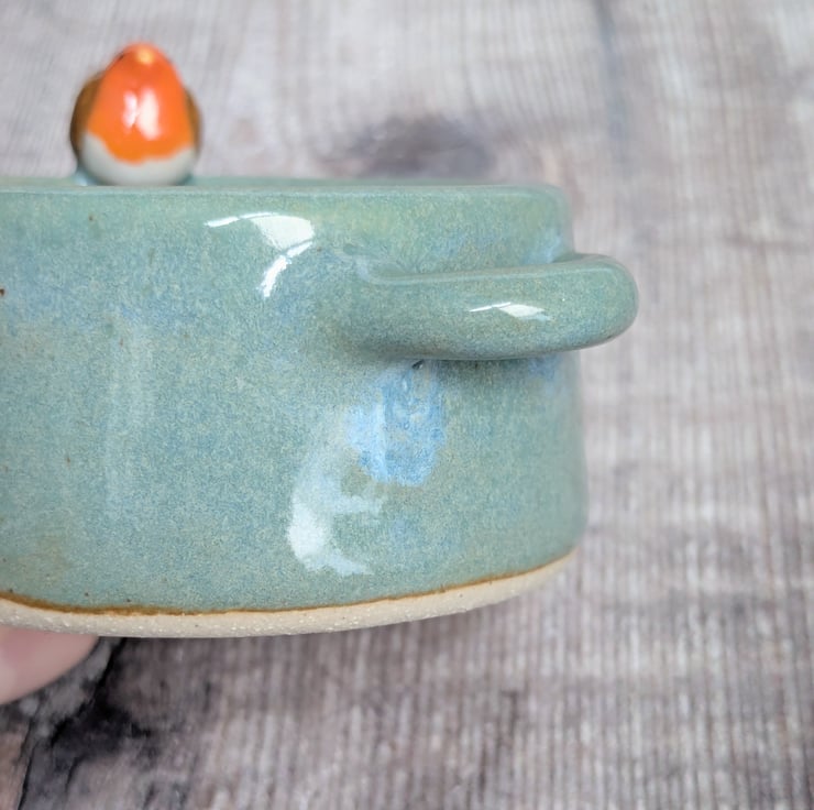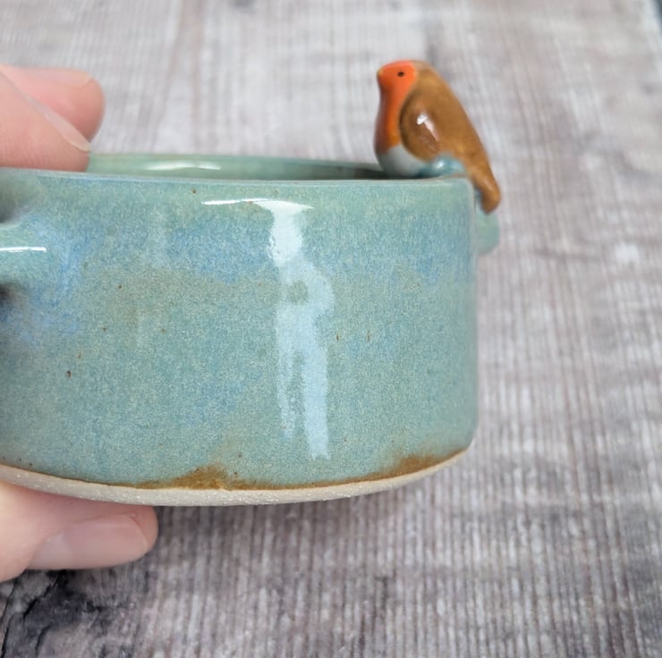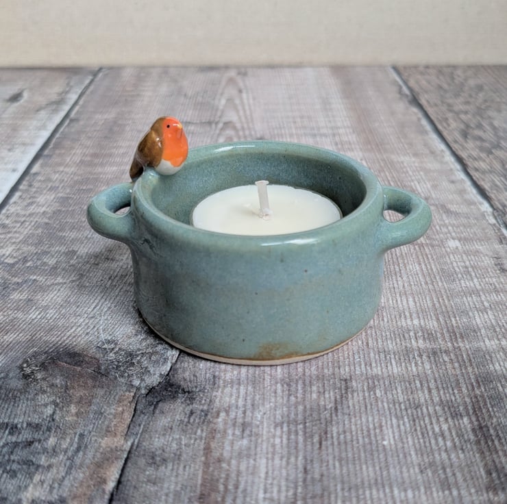 A ceramic tealight holder wheel thrown from a white stoneware clay. The glaze is a beautiful mid turquoise with a subtle fleck. Two small handles are on either side and a small hand painted and hand sculpted robin is perched on the rim. (Candle is not included).