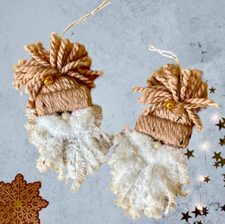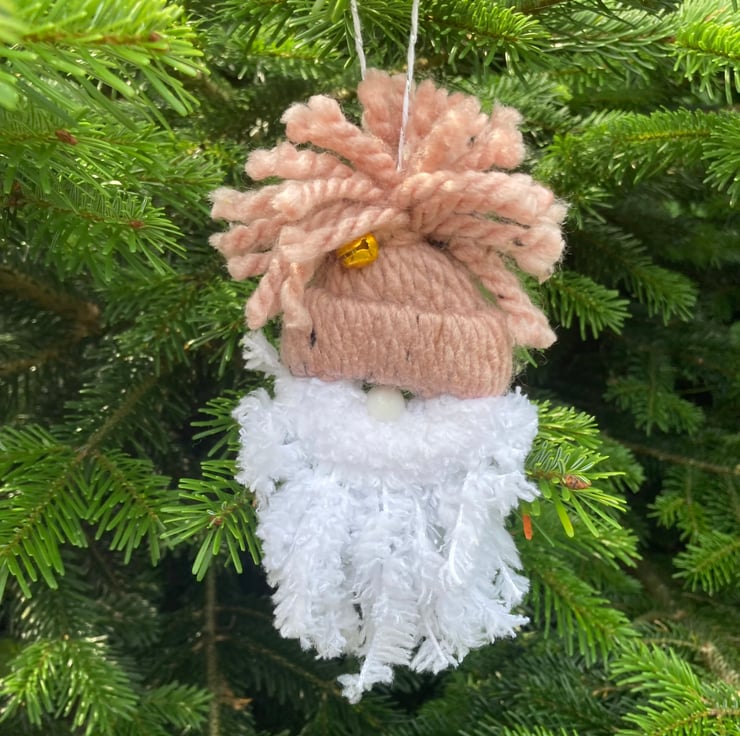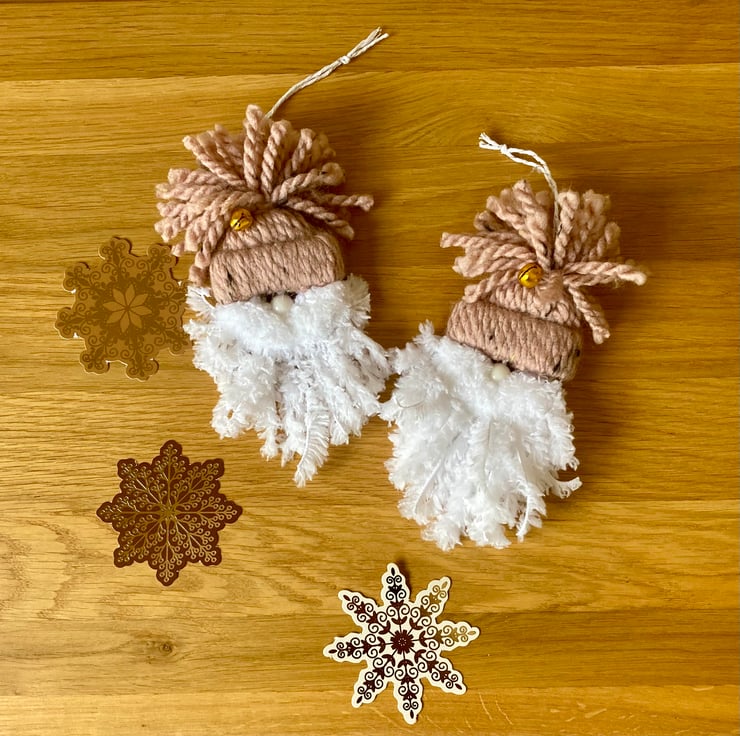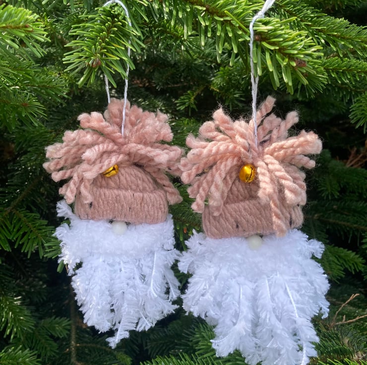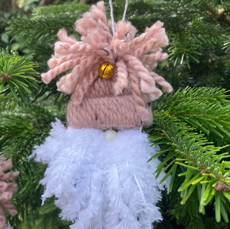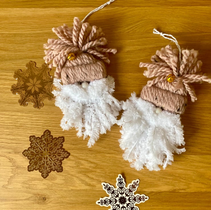 These cute little decorations have been made using up cycled curtain rings which have been decorated with white fluffy wool beards and a pink speckled bobble hat with a gold bell. A white bead has been added for the nose.
