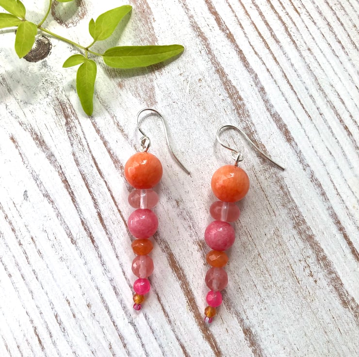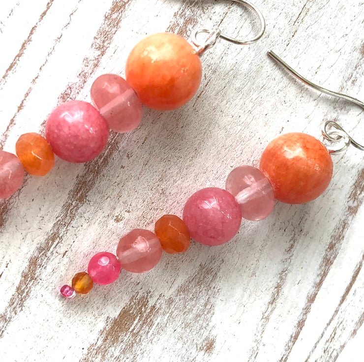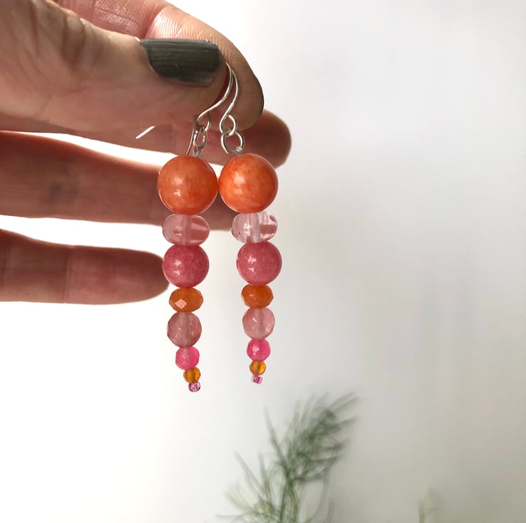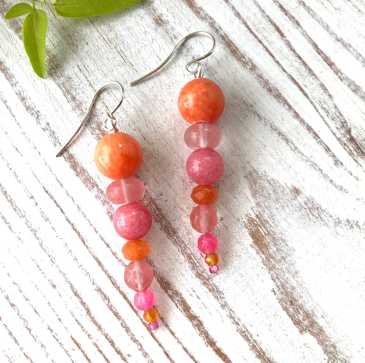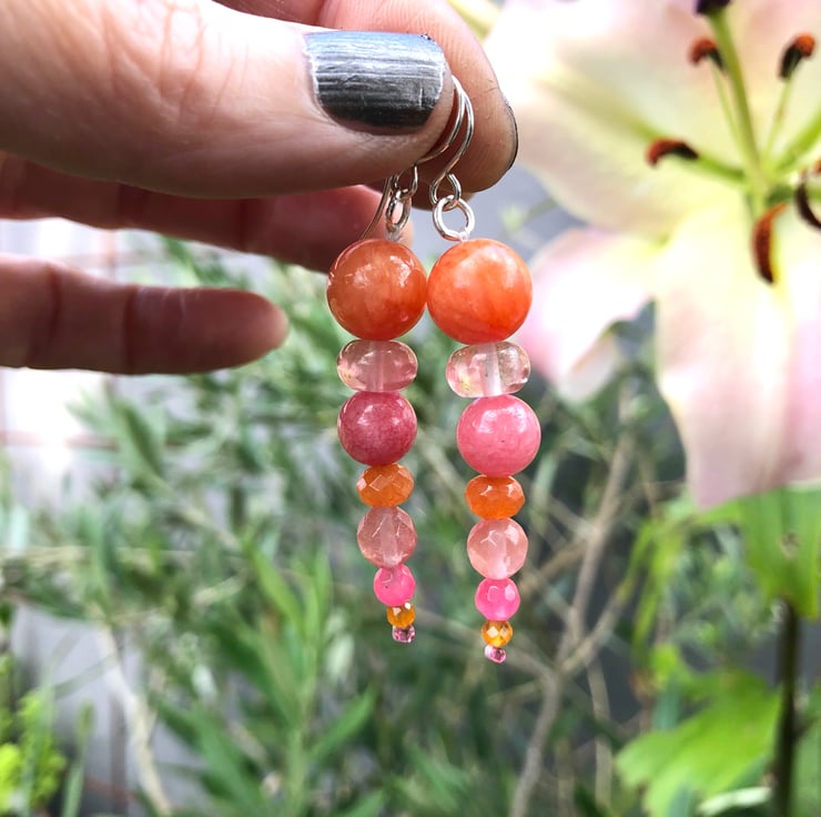 These bright orange & pink gemstone bead stack earrings feature orange Jade, Watermelon Quartz, pink Morganite, Carnelian,pink Jade and Cherry Quartz. They are stacked on high quality Japanese beading thread and finished with handmade 925 sterling silver jump rings and hooks.