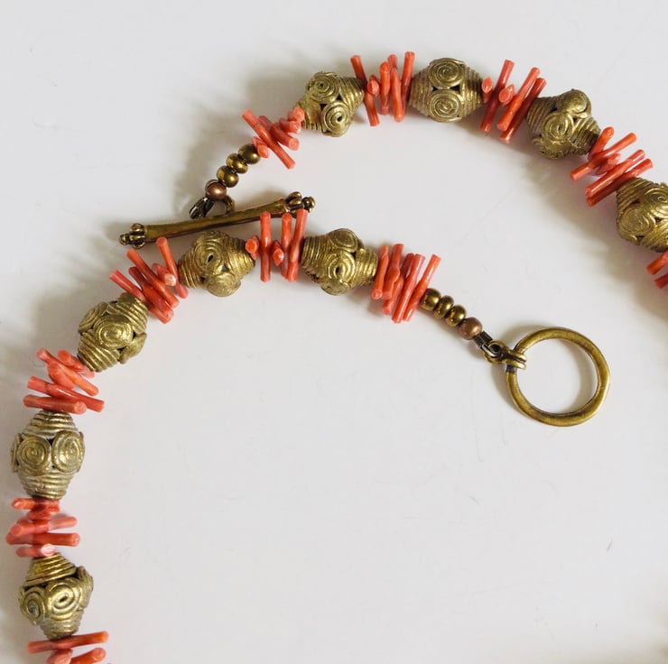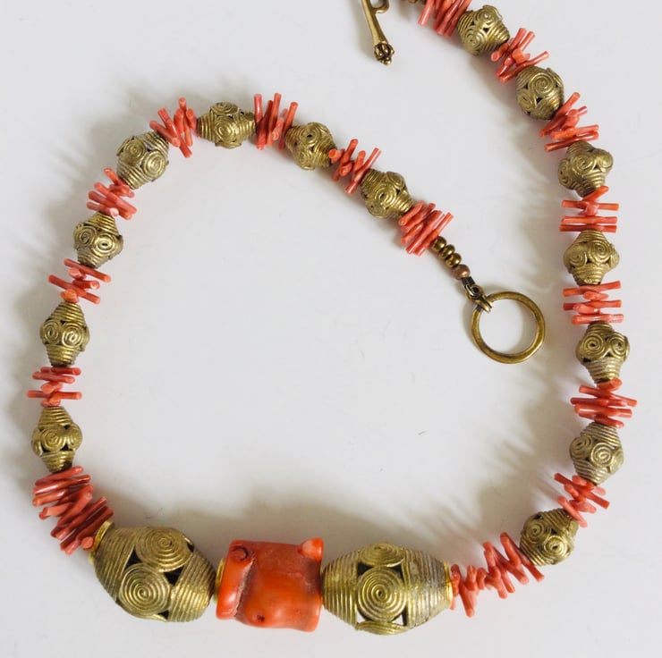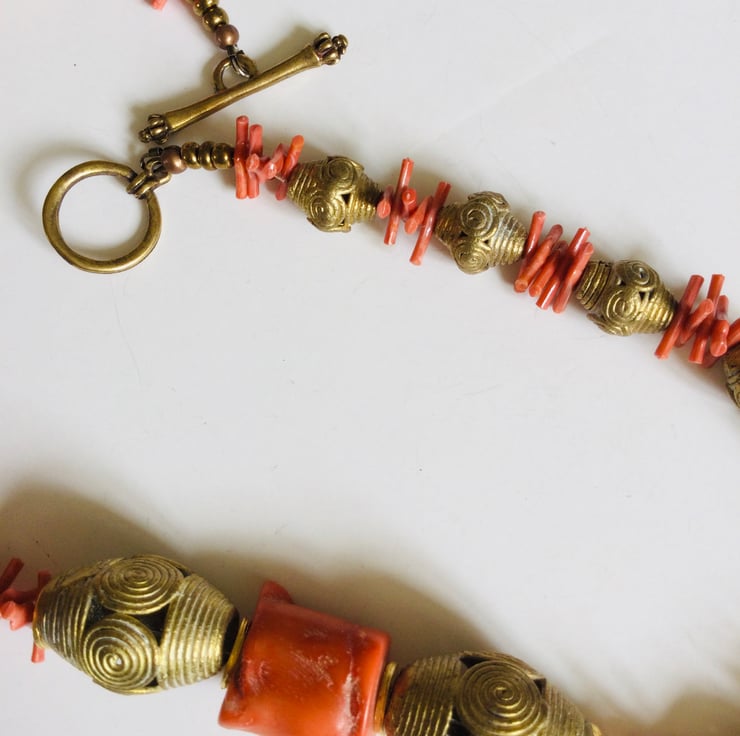 I bought the brass beads direct from Ghana from a fair trade shop. They are really beautiful and being hand cast, each one is unique. To enhance these beautiful artisan beads I added delicate strands of recycled vintage coral.