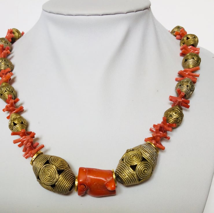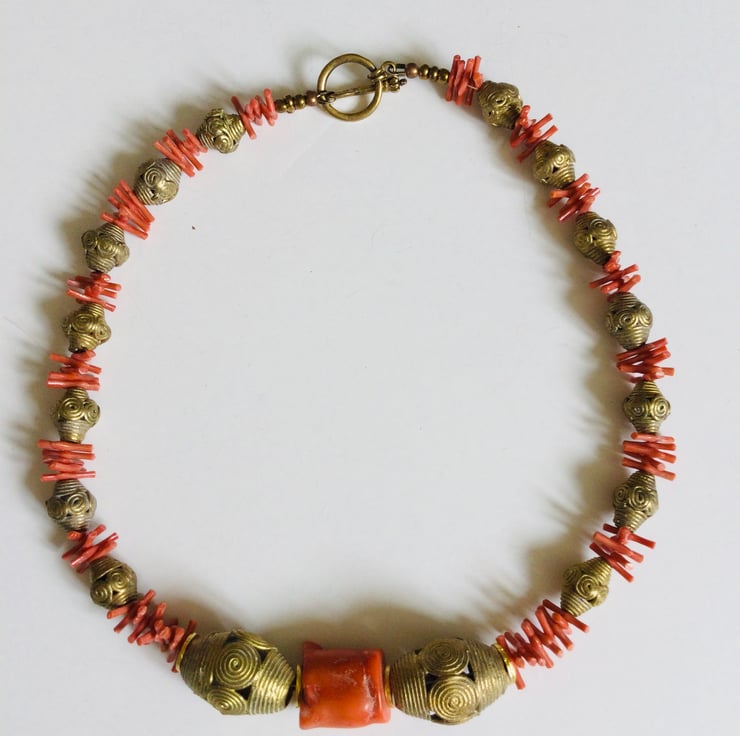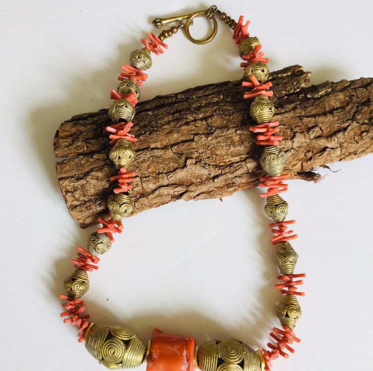 A beautiful beaded necklace featuring vintage coral and hand made African brass beads from Ghana. These brass beads are still made using the ancient lost wax method so each one is slightly different. The central focus of the necklace is a large irregular chunk of bamboo (deep sea) coral flanked on each side with large decorative brass beads. Smaller versions of these brass beads form the remainder of the necklace interspersed with small pieces of recycled vintage coral. The total length of the necklace is 47 cm and it fastens with a large brass toggle and bar.