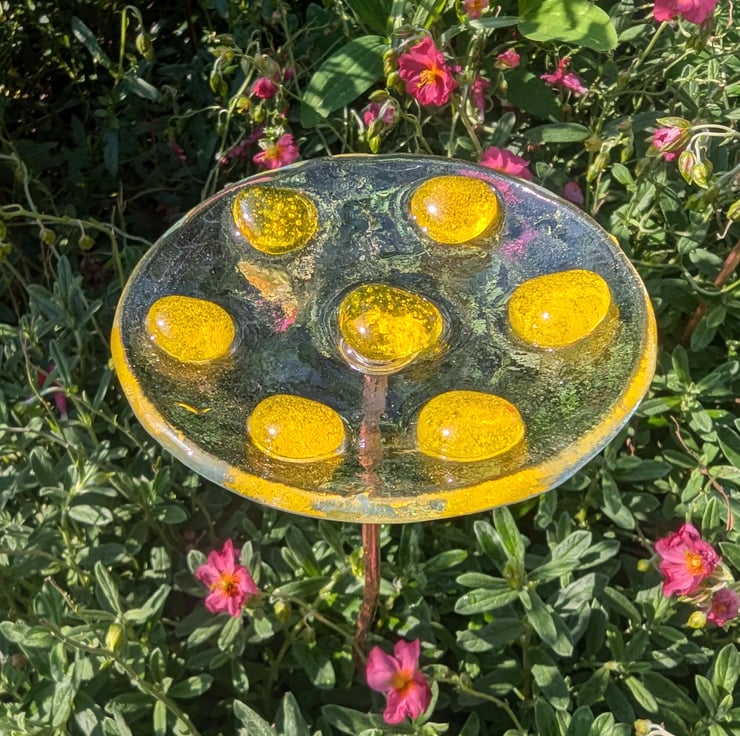 A brand new design of shallow Bee Cups for your outdoor space featuring landing pads for bees and butterflies, handmade using specialist art glass and copper.