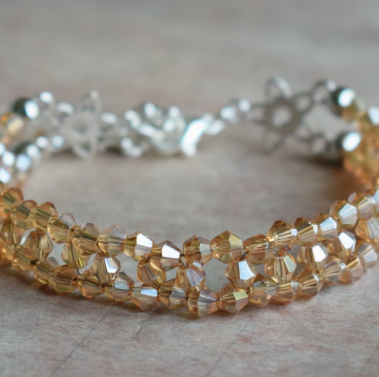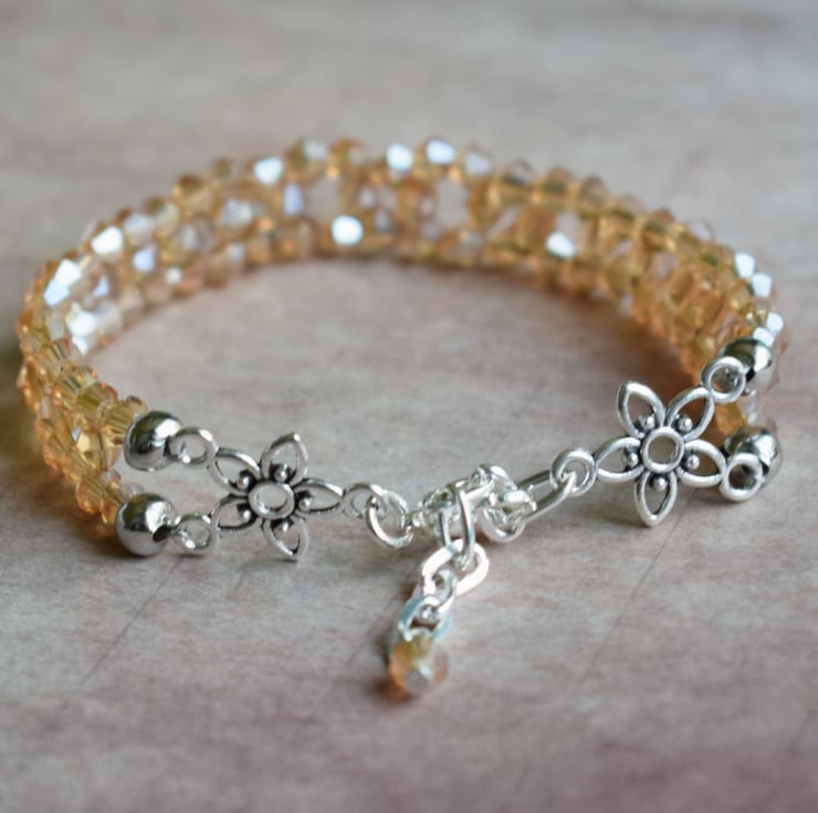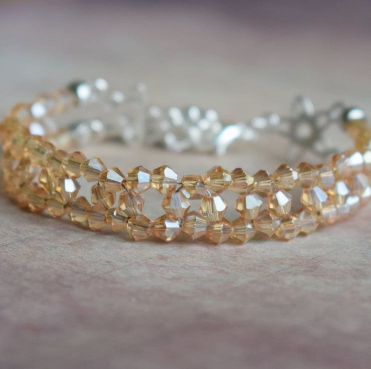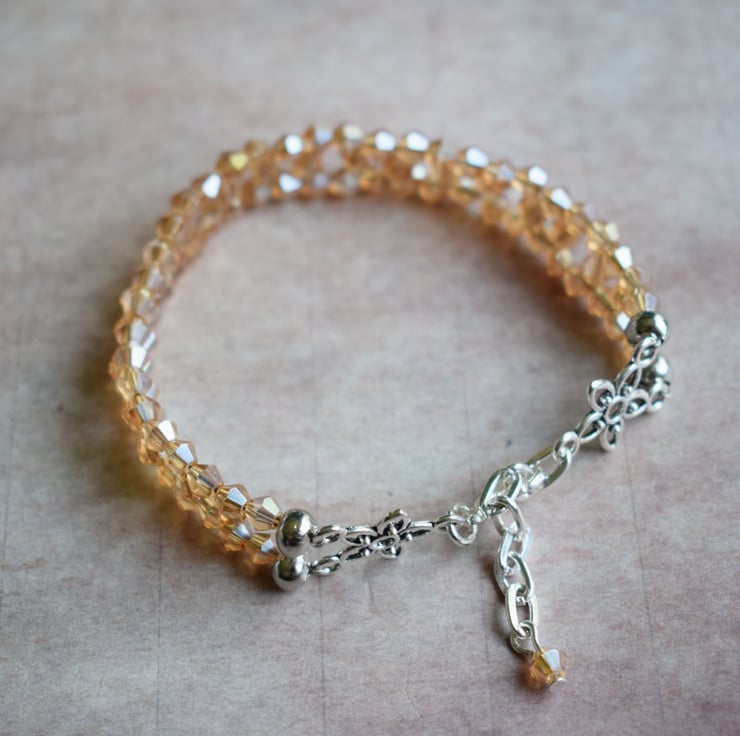 I have made this with some tiny bicone shaped glass beds in a pretty pale topaz or champagne colour. It has two flower connectors near the clasp and an extender chain so it can be worn between just over 7 inches to just under 8.5 inches. It is nice and danity at just under half an inch across so just gives that little bit of twinkle without being too gaudy.