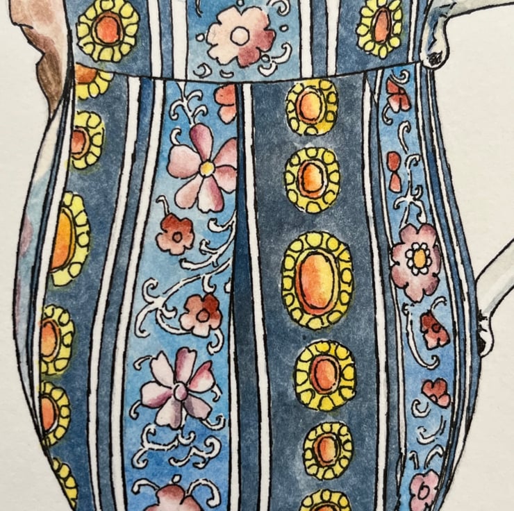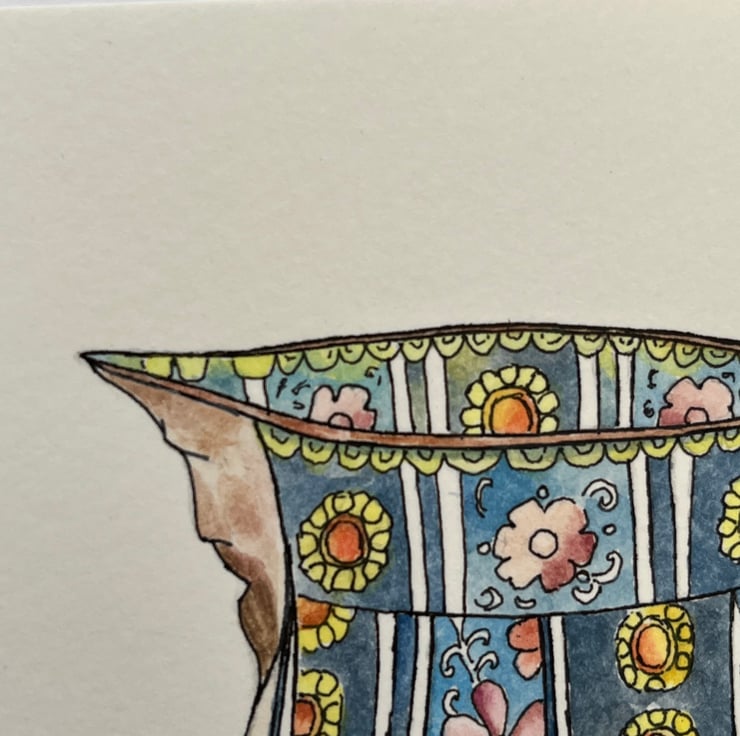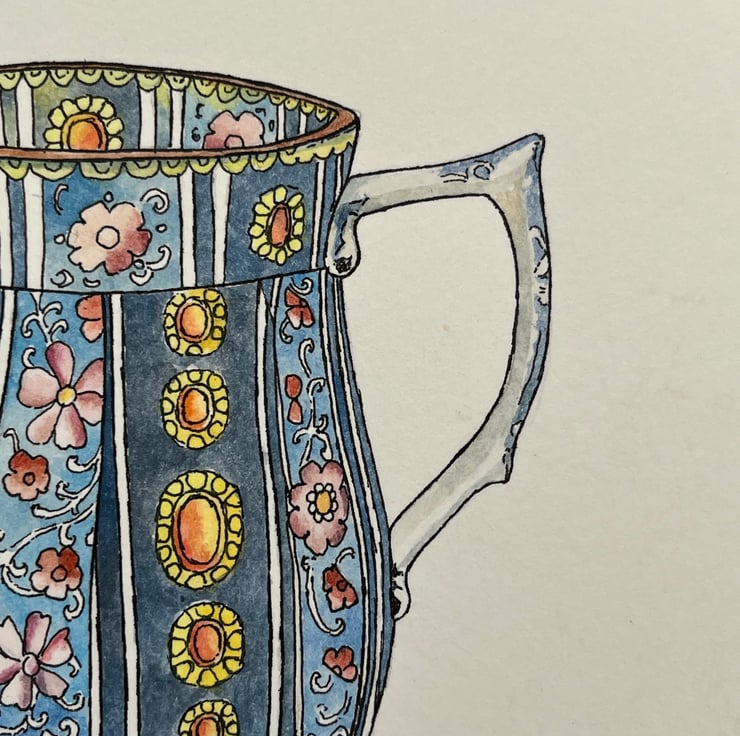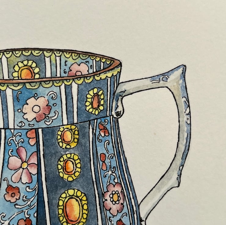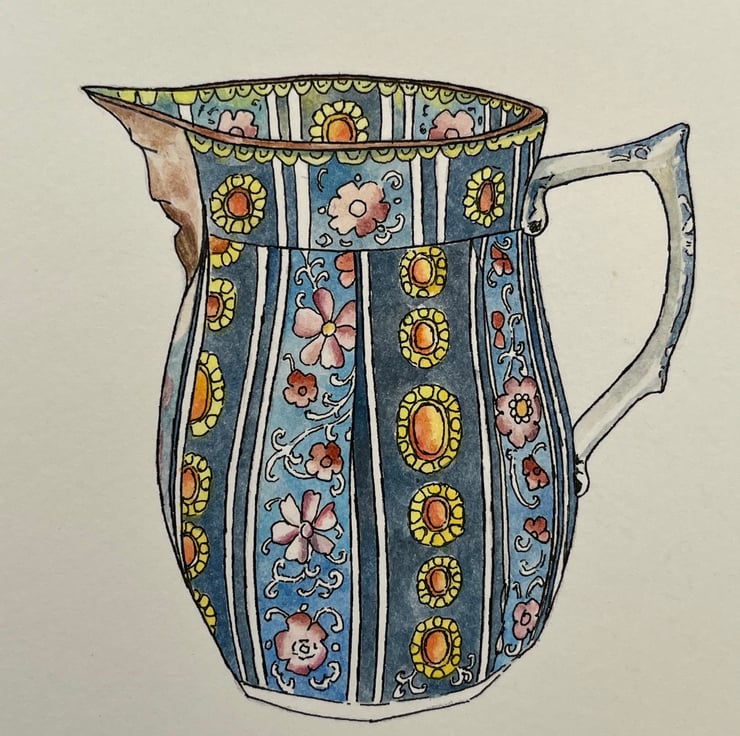 An original gouache and ink painting of an enamelled Pearlware pitcher jug. The paper is acid free 300gsm artists watercolour paper and measures 14cm by 14cm and the image measures approximately 8cm by 9cm. An original painting that would make an ideal gift. The painting will be sent in a board back envelope.