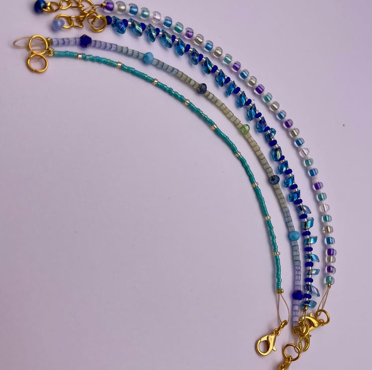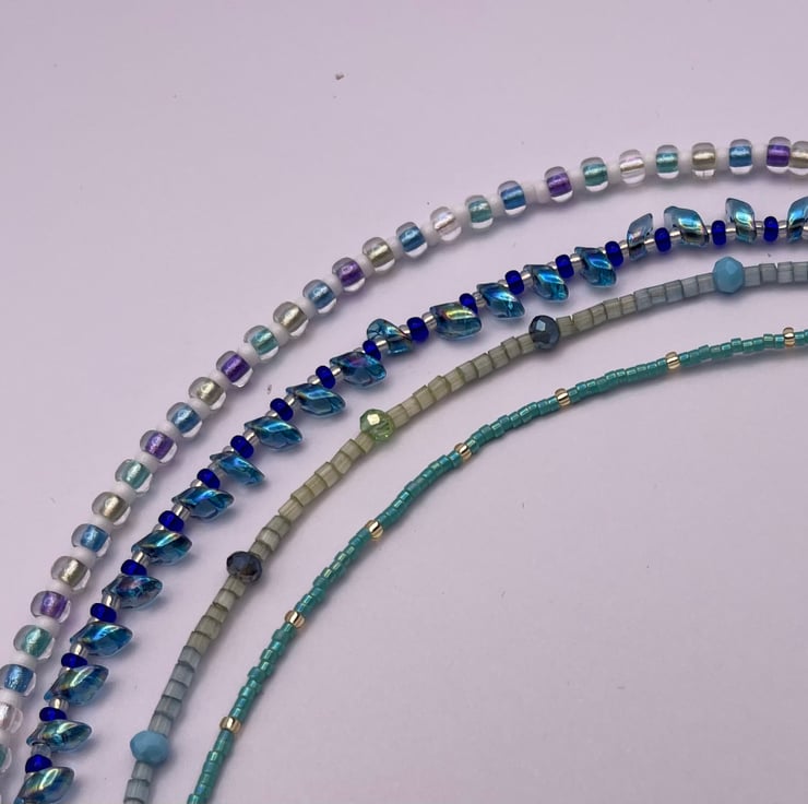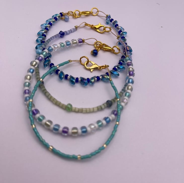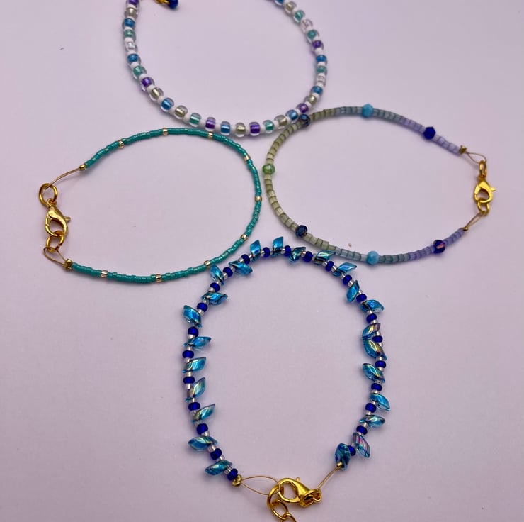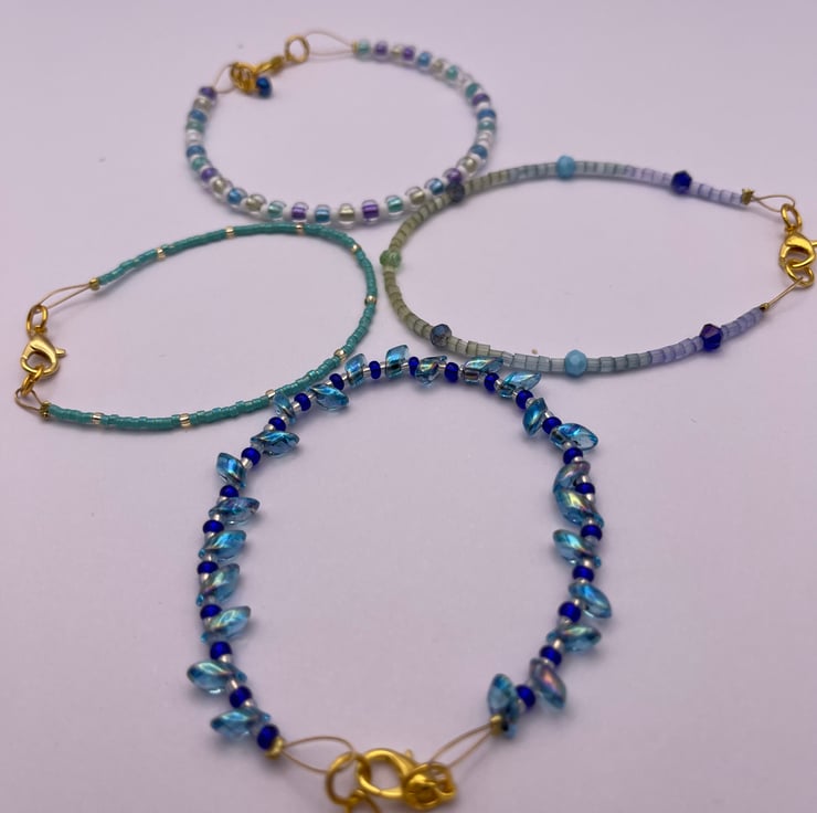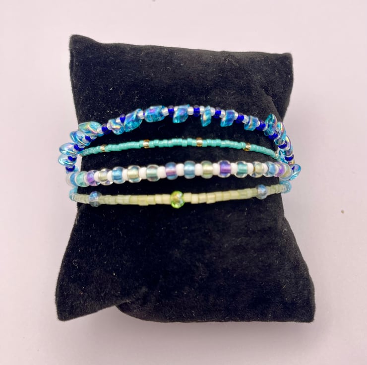 Set of 4 beaded glass bracelets, complementary colours that can be mixed and matched, worn individually or as a set. Handmade using high quality glass beads, colours taking inspiration from holidays in the Greek Islands.