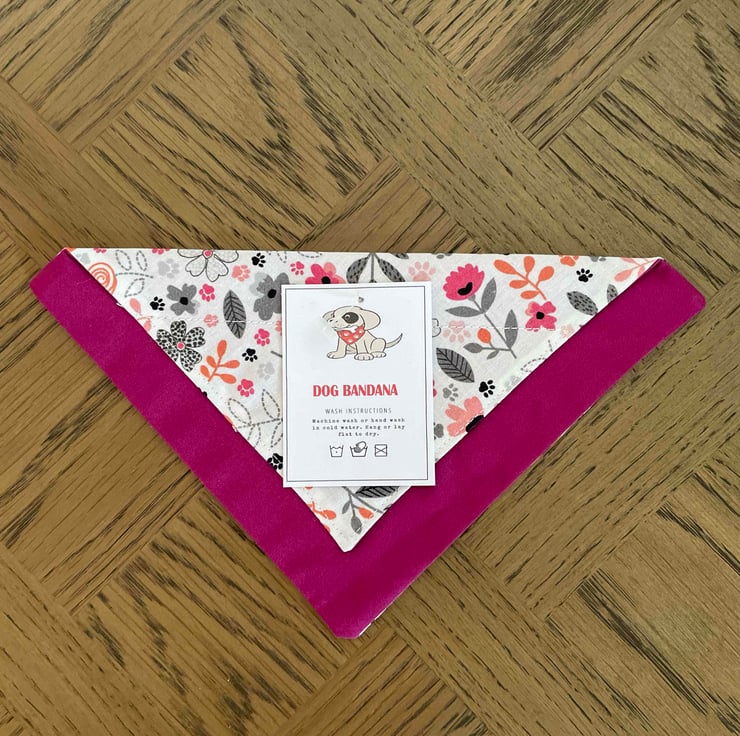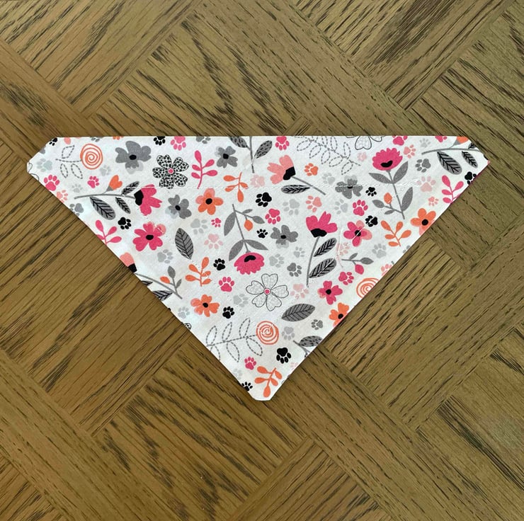 A decorative bandana for a cat or small dog. Bandana is made from patterned fabric with white background decorated with pink flowers and black paw prints. Contrast backing in deep pink fabric. Bandana measures 10 ins across and 5.5 from top to pointed bottom. There is a channel across the top to insert collar. Gap for collar is 1inch