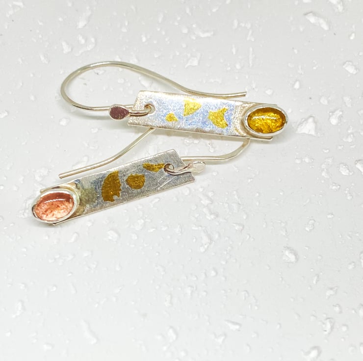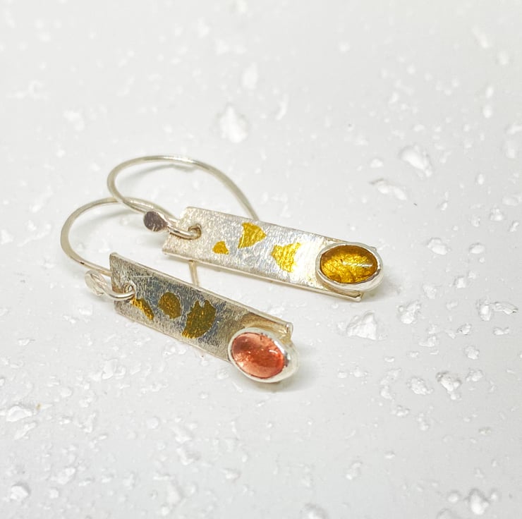 These handmade silver earrings feature mismatched coloured tourmaline stones, adding a playful touch of colour. Accented with 24k gold keum boo, the design combines cool silver with warm gold detailing, creating a balanced yet unique look. Perfect for those who love something unique. one of a kind, handmade in my workshop using traditional metal smithing techniques.