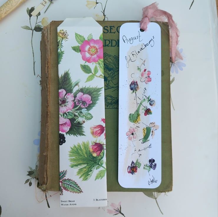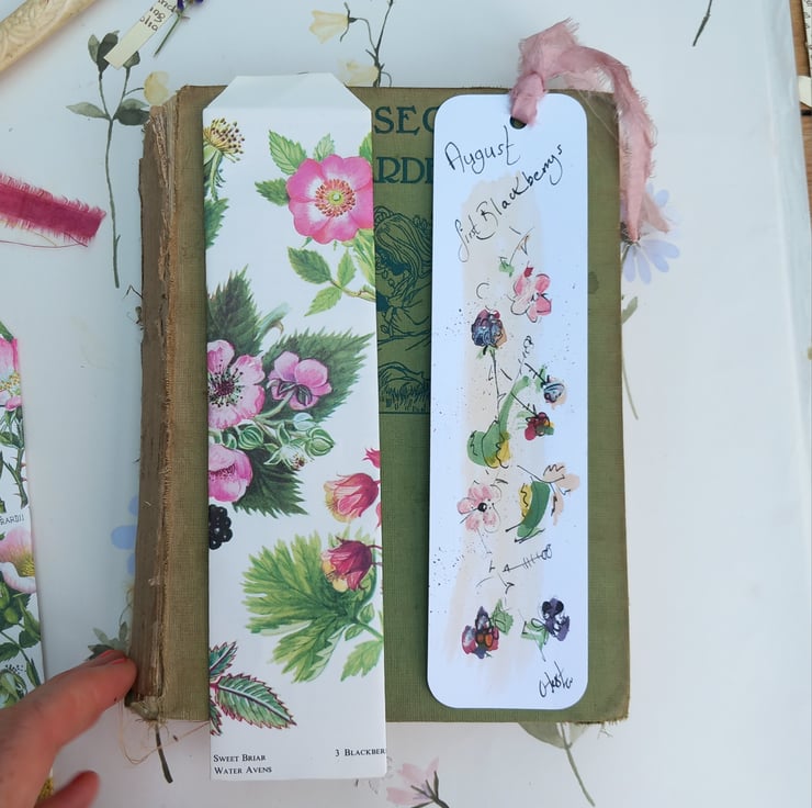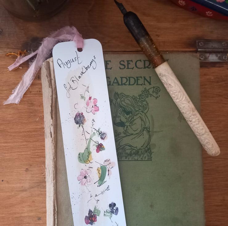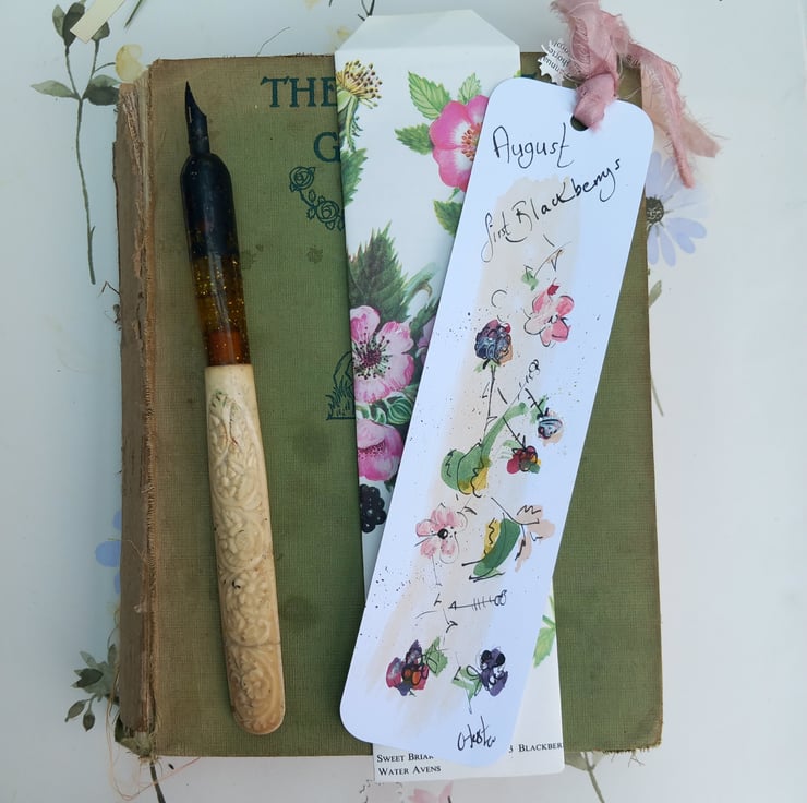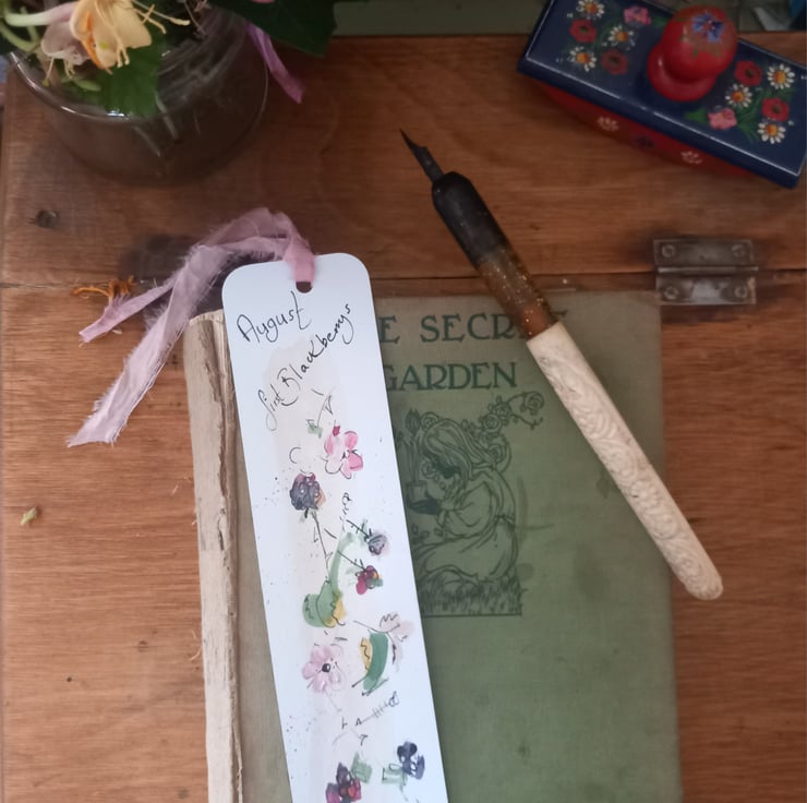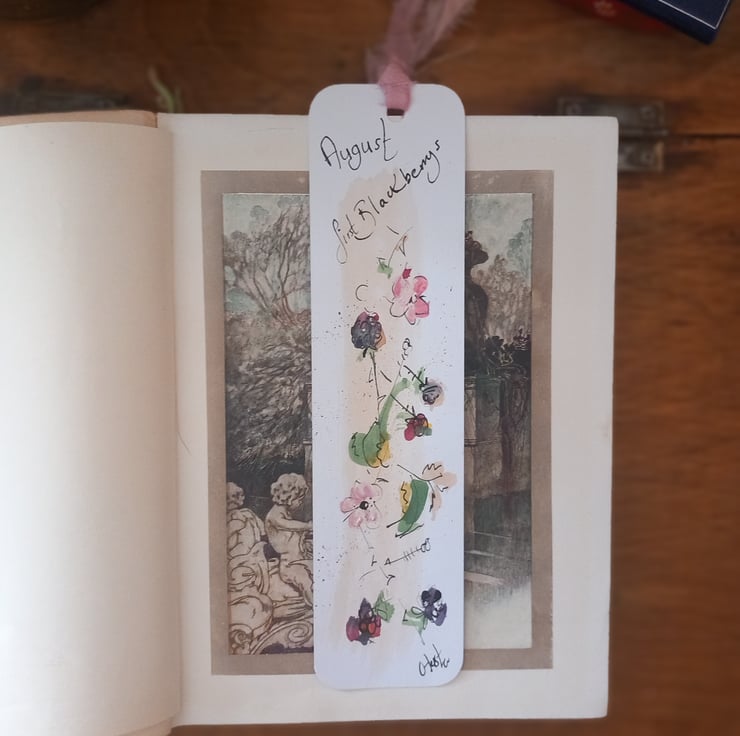 These are my individual drawn bookmarks. This one blackberries. Celebrating the months and nature. Each one has a silk trim at the top and comes in a handmade envelope that my mum makes so neat and beautiful I then pop them in an envelope with a card back .a mindful gift to post or add to a book present. Happy reading may it bring you joy every time you open your book.