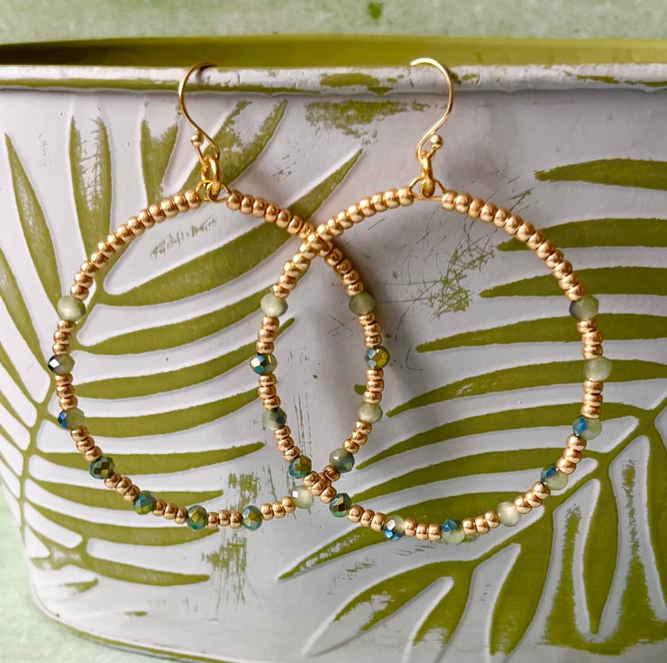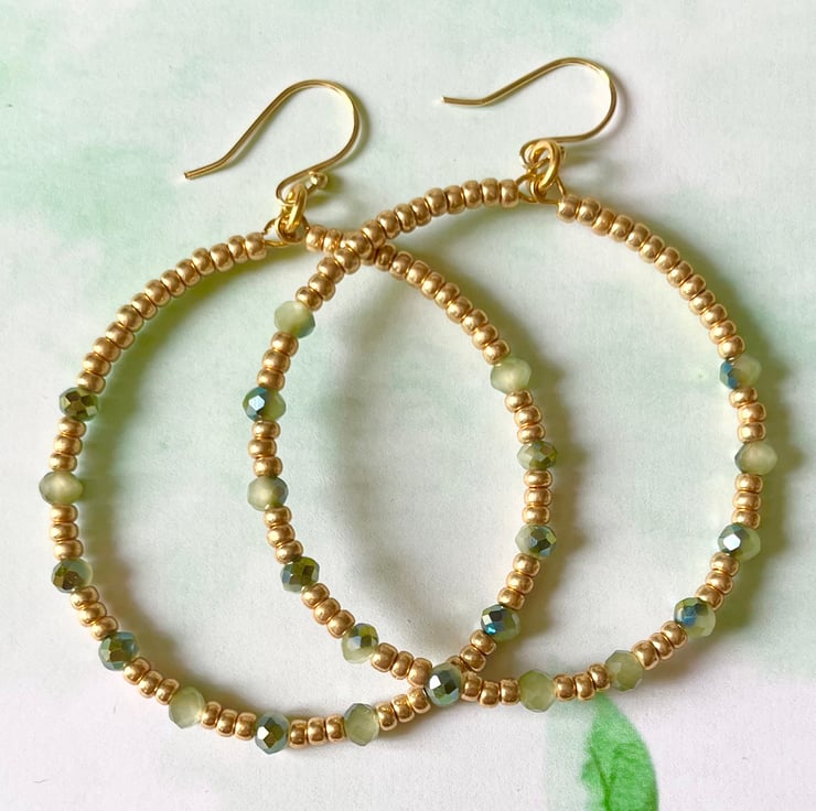 These stunning hoops have been made with 4mm faceted olive two tone coloured glass beads, and 3mm gold coloured glass miyuki seed beads..