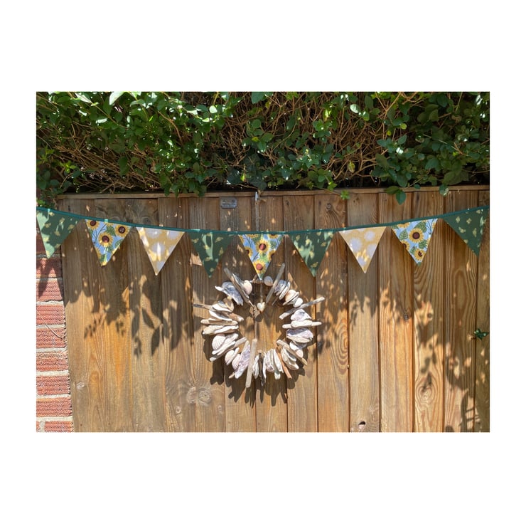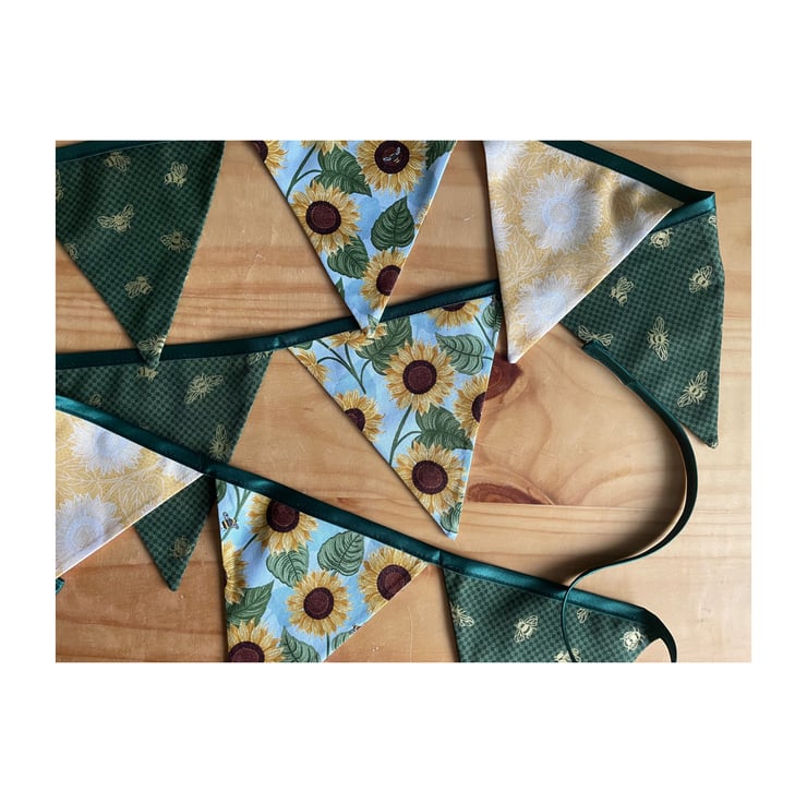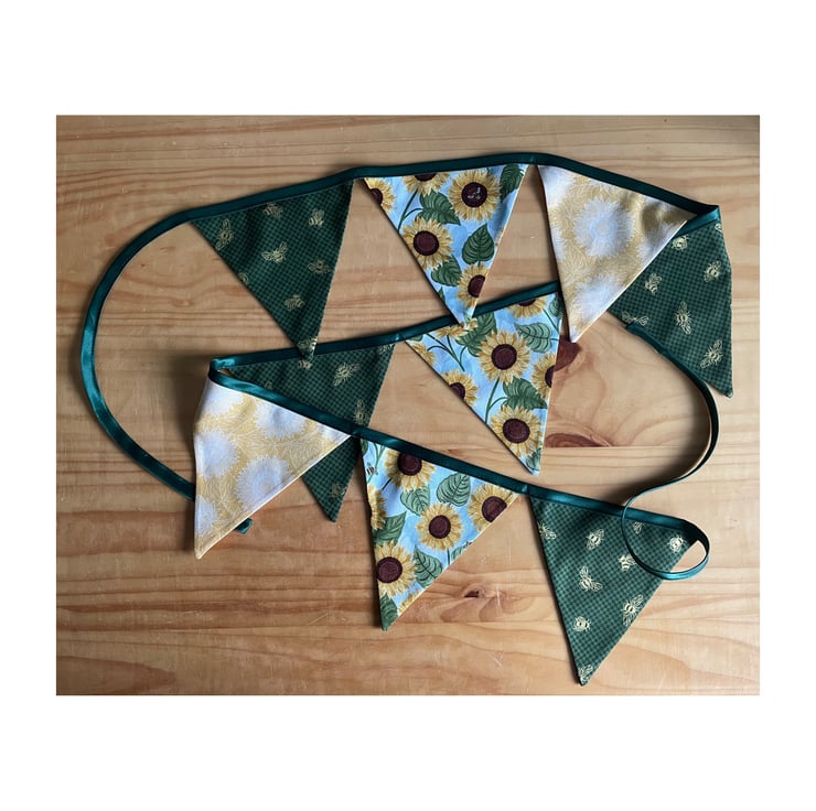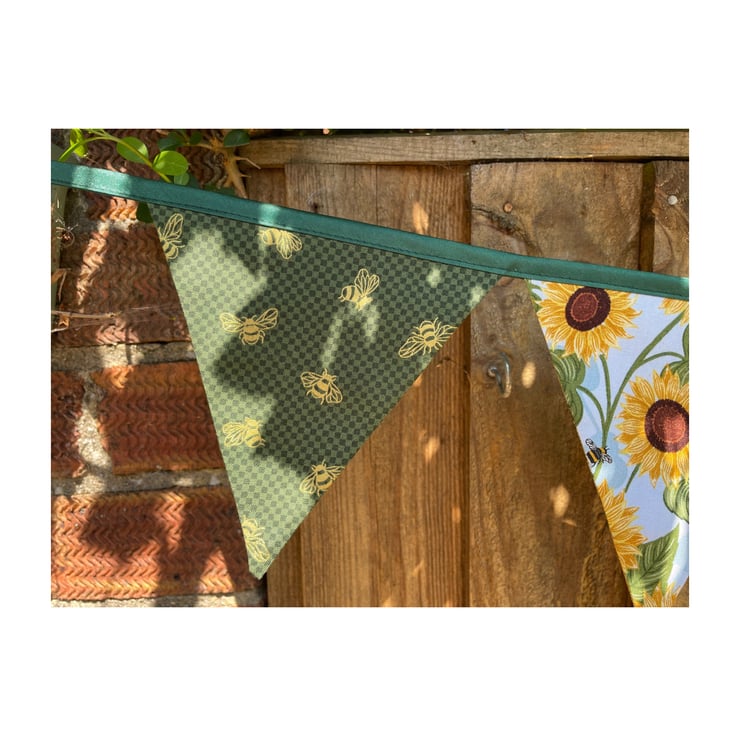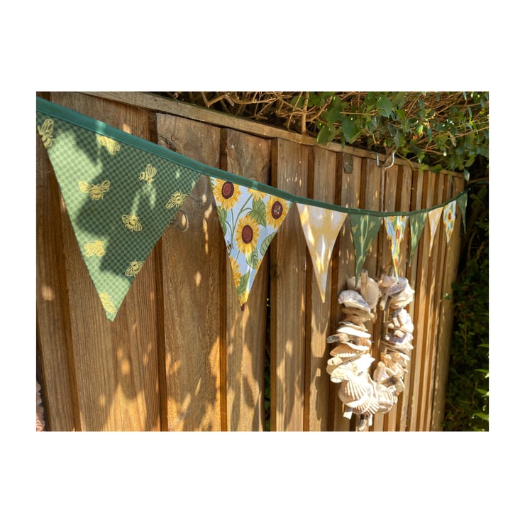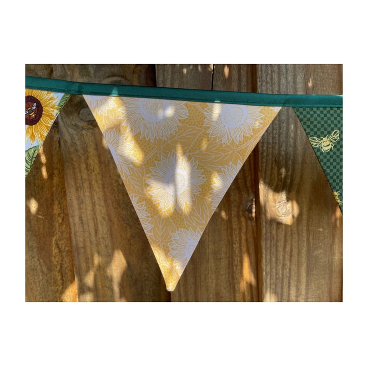 Summery bunting with sunflowers and bees. 9 double sided panels. It’s 210 cm long. The flags are approx 14 cm long and 14cm wide at the top.