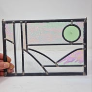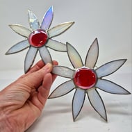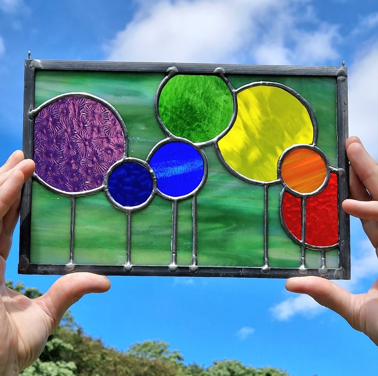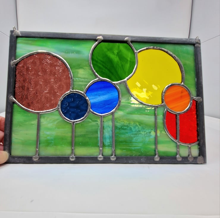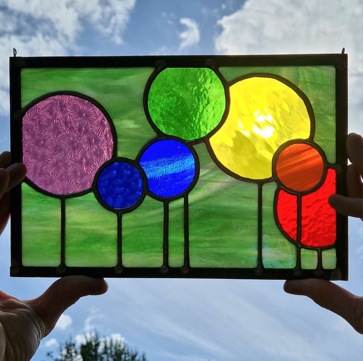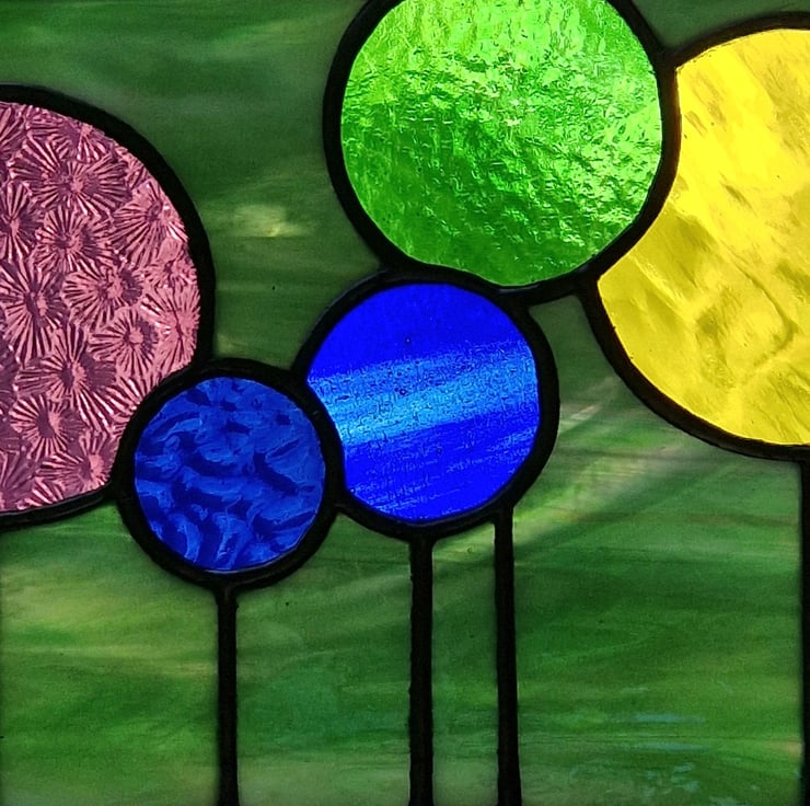 A great variety in texture and all are really vibrant with great colour density. Placed together they represent abstract (lollipop) flowers. Each lollipop flower placed in a green garden background which is cut from a translucent, streaky iridescent glass.