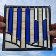 Once cut the edges of each piece are ground then copperfoil stuck to all the pieces, placed together and soldered into place. To give a substantial weight and pleasing feel to the piece I have added a lead edge which is then soldered and cemented.