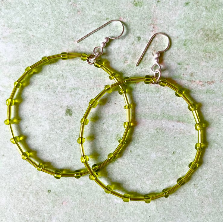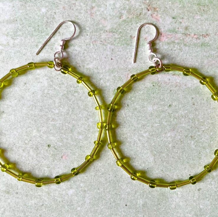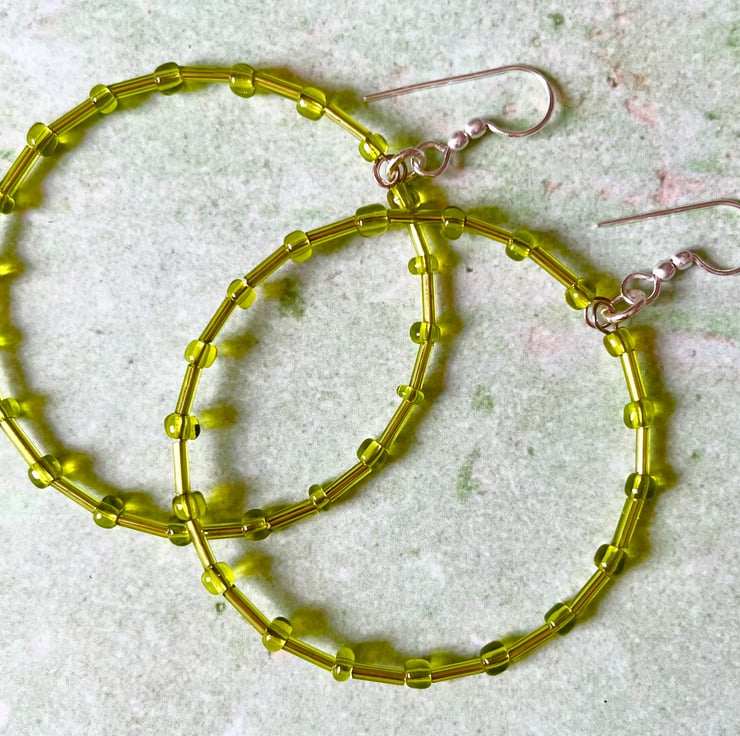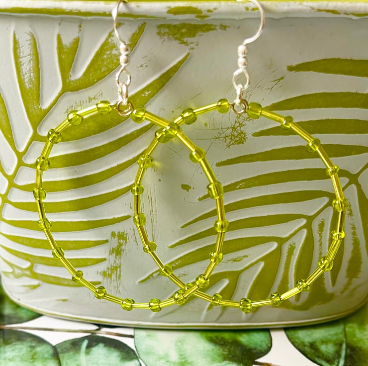 These fun hoops have been made with 4mm lime green coloured glass seed beads, and 6mm lime green coloured glass bugle beads.