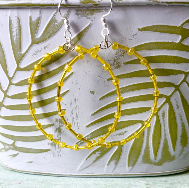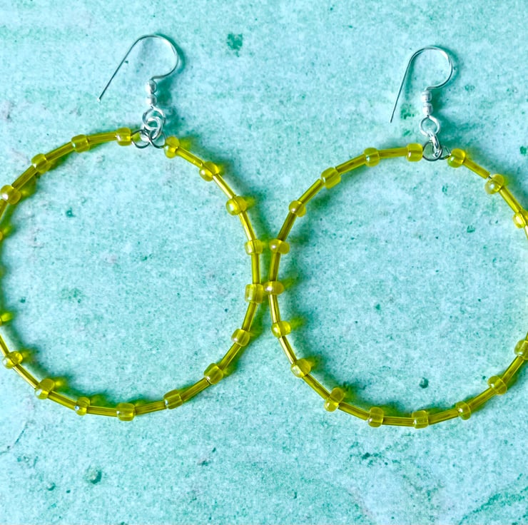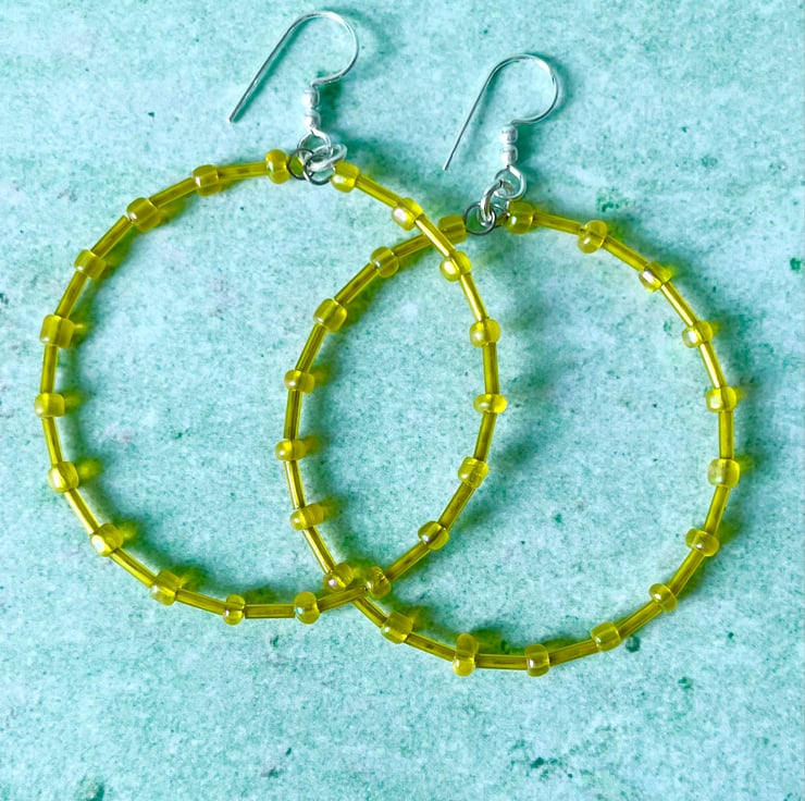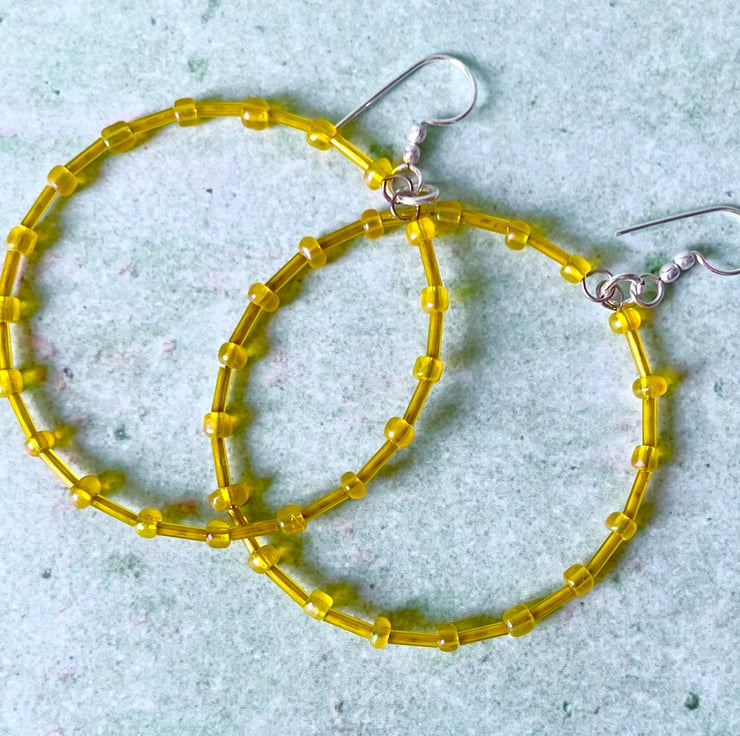 These fun hoops have been made with 4mm yellow coloured glass seed beads, and 6mm yellow coloured glass bugle beads.
