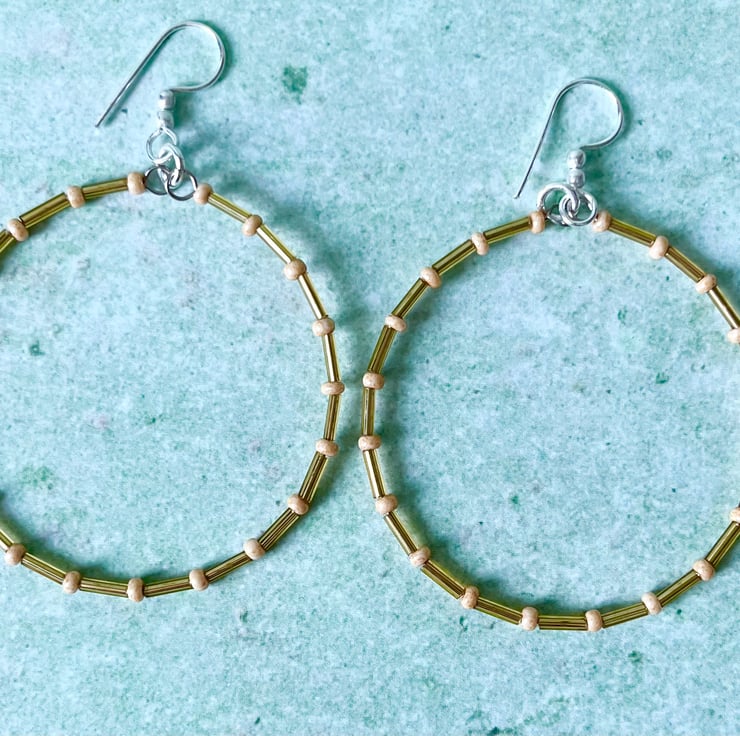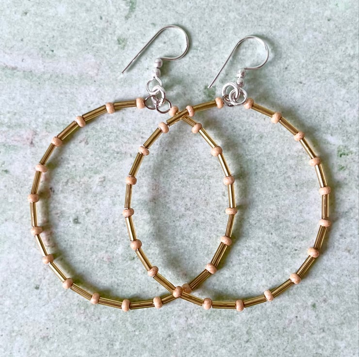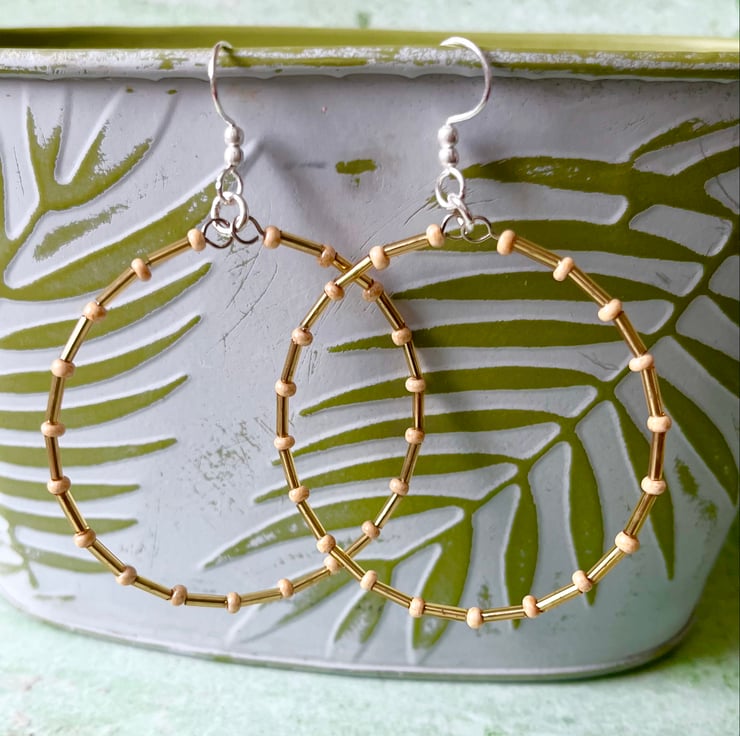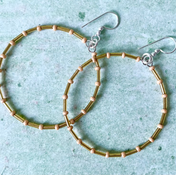 These fun hoops have been made with 4mm opaque beige coloured glass seed beads, and 6mm light gold coloured glass bugle beads.