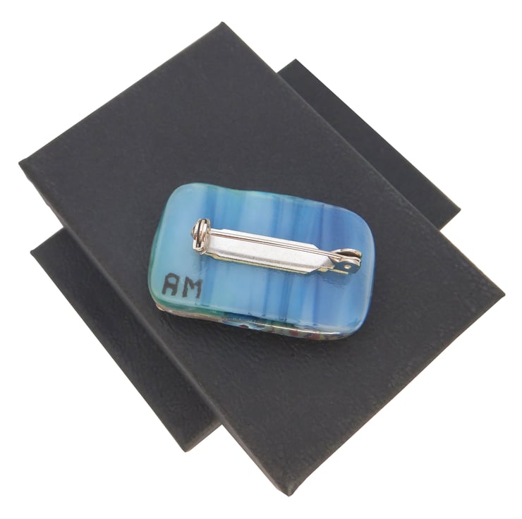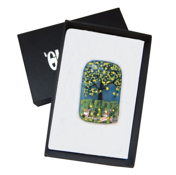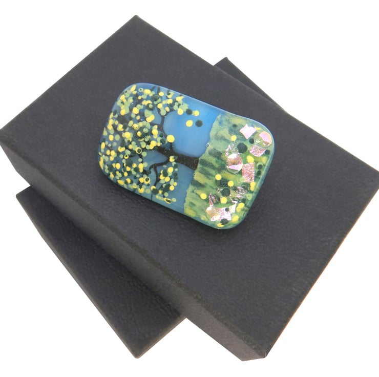 Carefully made by sandwiching a background layer of wispy blue bullseye glass with a cover of transparent glass. The tree and ground were hand painted using glassline on the blue background glass. The Spring foliage and sparkling foreground were then layered onto the transparent section of glass. Once fused in my kiln these different layers give the brooch a feeling of depth and a three-dimensional appearance.