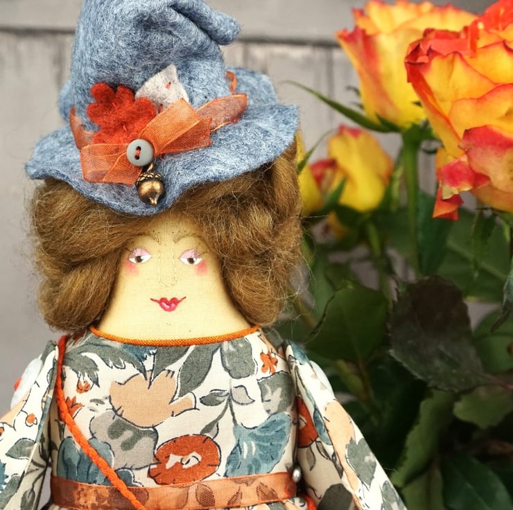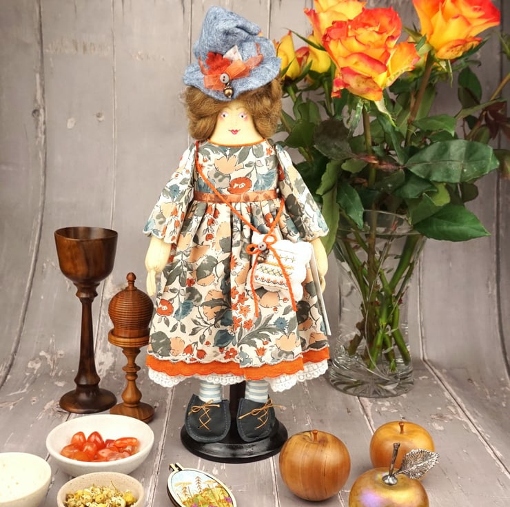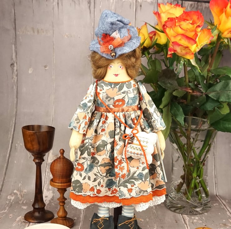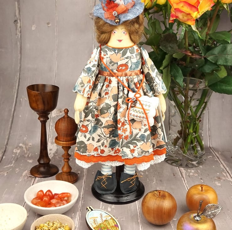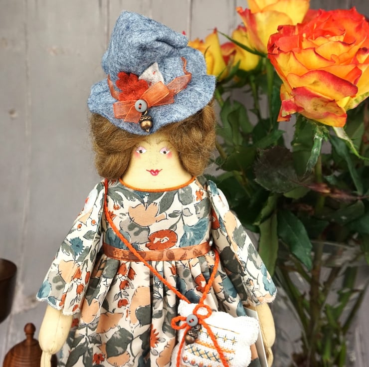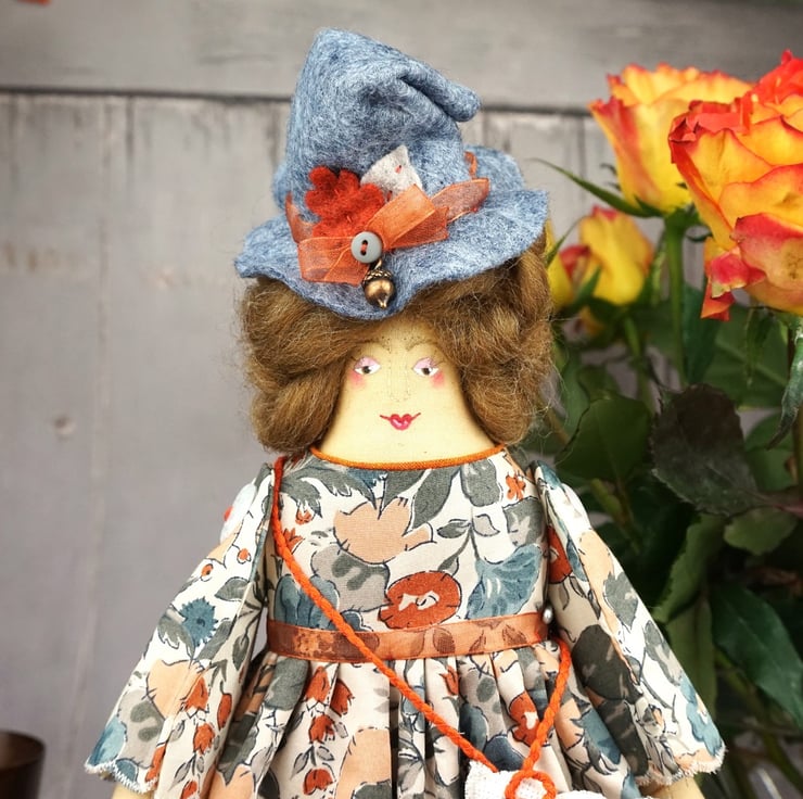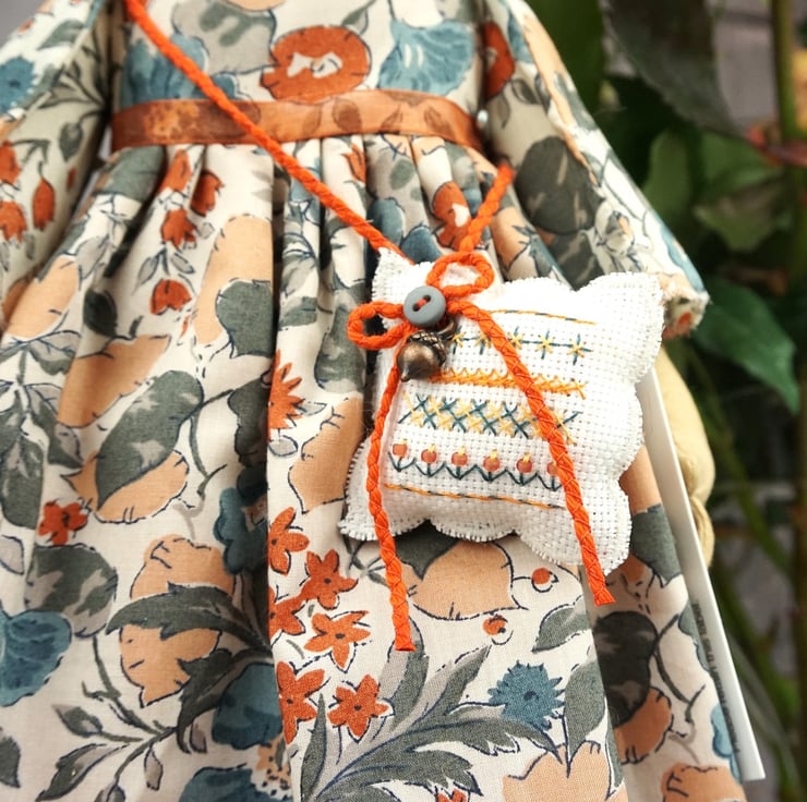 She is dressed in a vintage Liberty print called Honesty and Poppy, a white ground with honesty and poppies picked out in warm blues and oranges. Her outfit is completed with tiny buttons, leather shoes and a little sampler on her little sachet. She has co-ordinating knickers and underskirts in cotton and white tulle lace. She has a little copper acorn on her hat and another on her sampler.