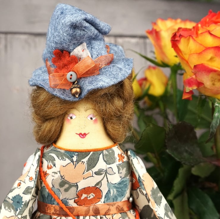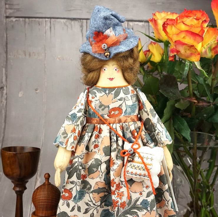If you come from Lancashire and you make dolls, well you are going to make a witch doll. I love my little witch dolls, they are not remotely wicked just sweet hedge witches that are kind and gentle. This little witch has a gentle smile with a wistful personality xx