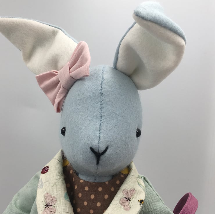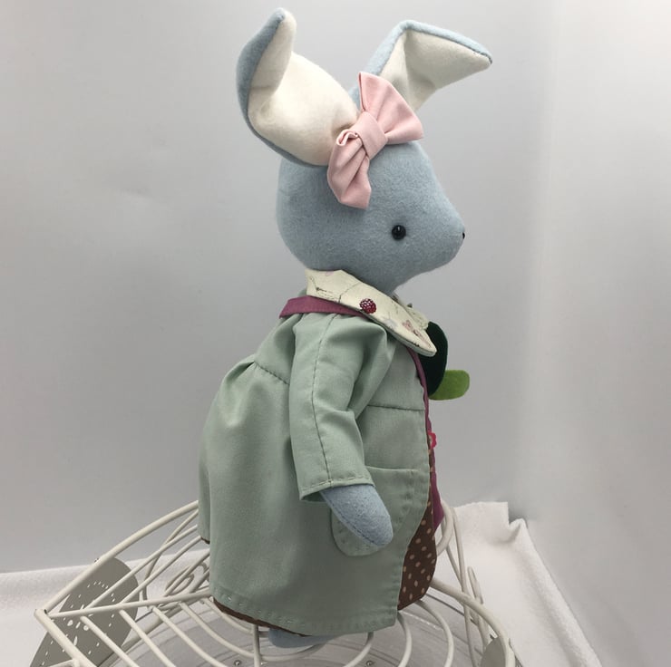 This 12” tall young bunny is hurrying to her school’s library before she has to be in class for nine o’clock. She is dressed for the walk in a light green coat with a contrasting collar and has a book bag which at the moment contains three carrots for her lunch. She can’t wait to meet her friends and learn more ‘ interesting things ‘ at school.