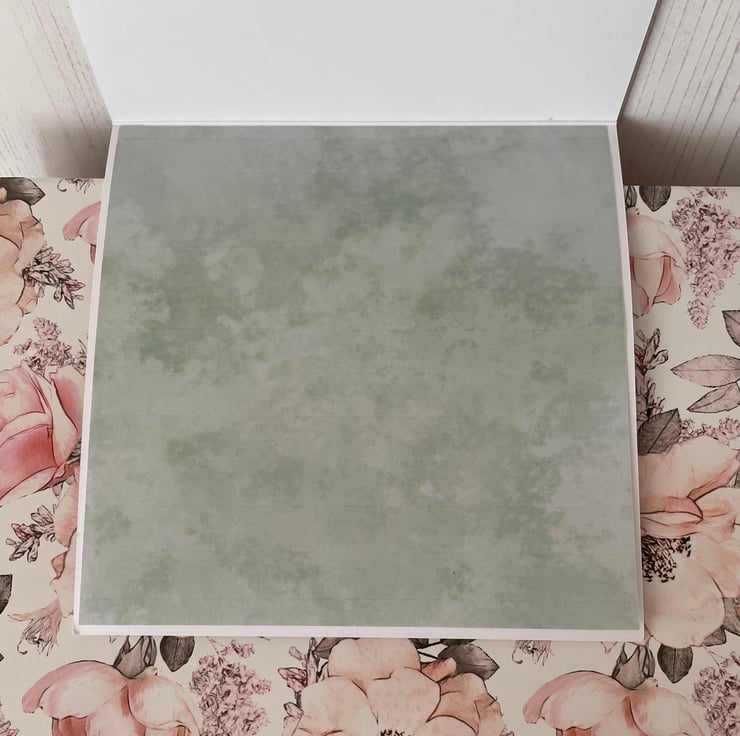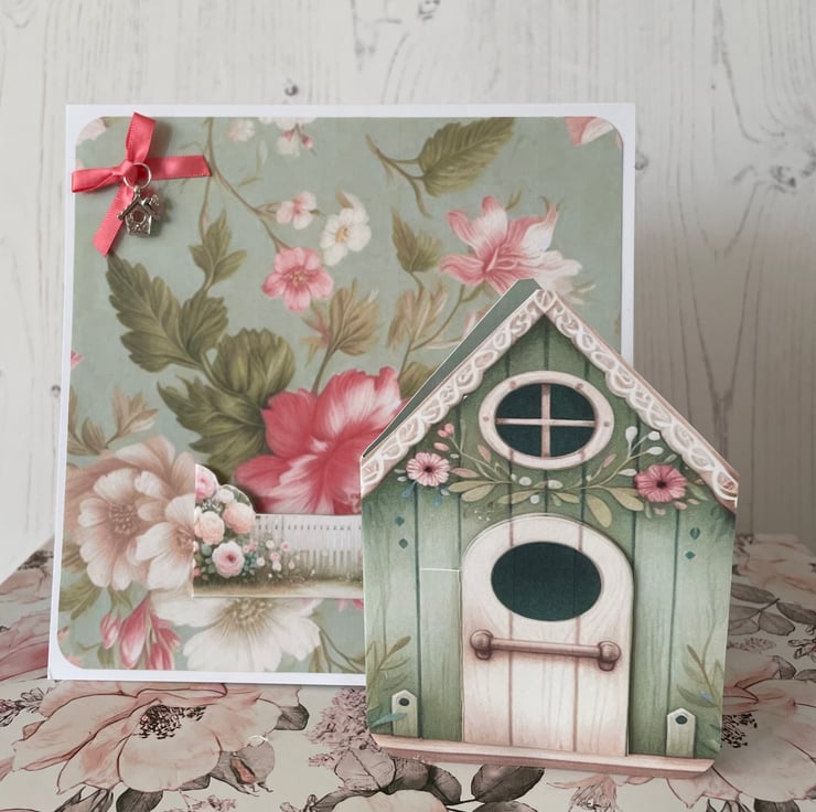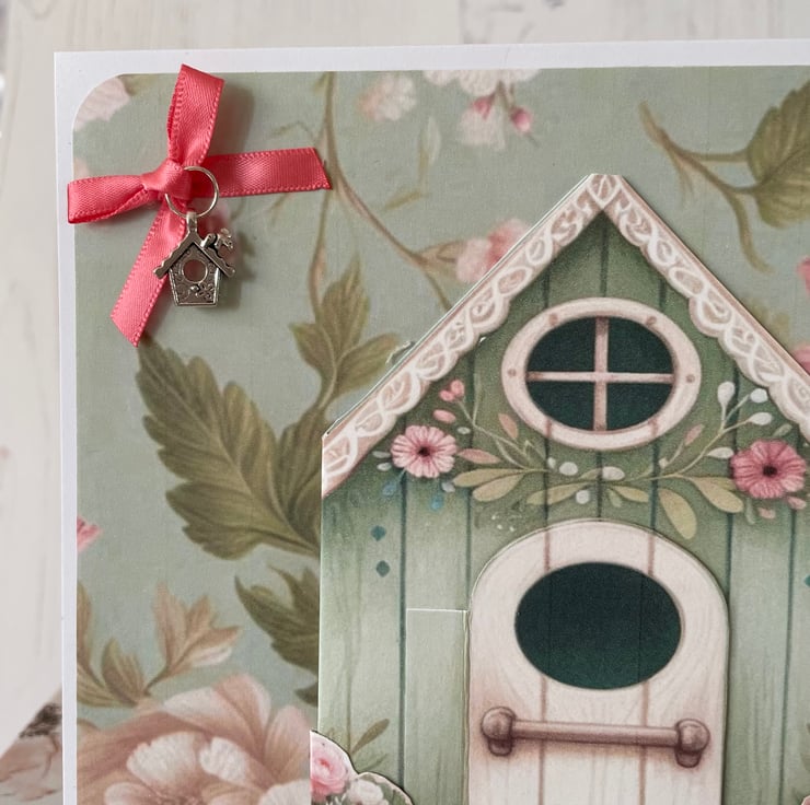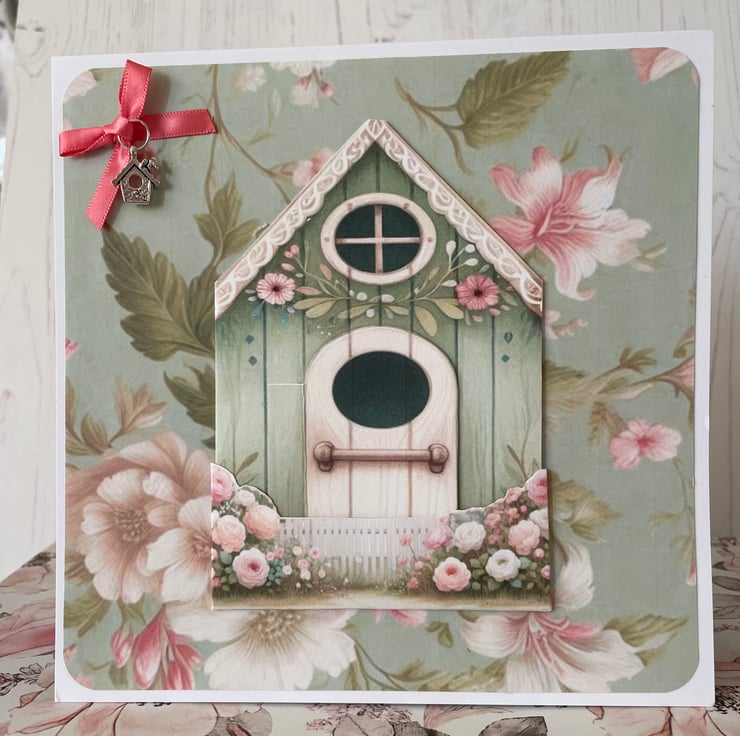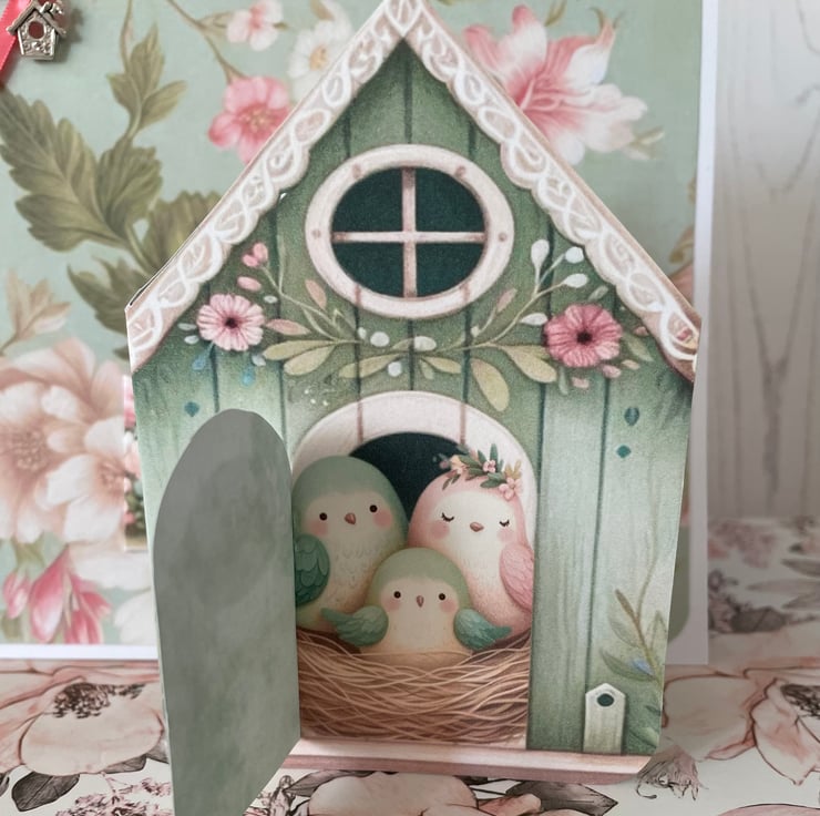 White card with a pretty floral background on sage. Pocket with mini interactive card on the front, the door opens to reveal 3 birds on a nest. Pink ribbon bow and bird house charm. Inside has a green marbled sheet left blank for your own message. Measures 6.75” x 6.75”. White envelope included.