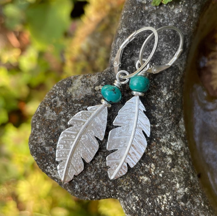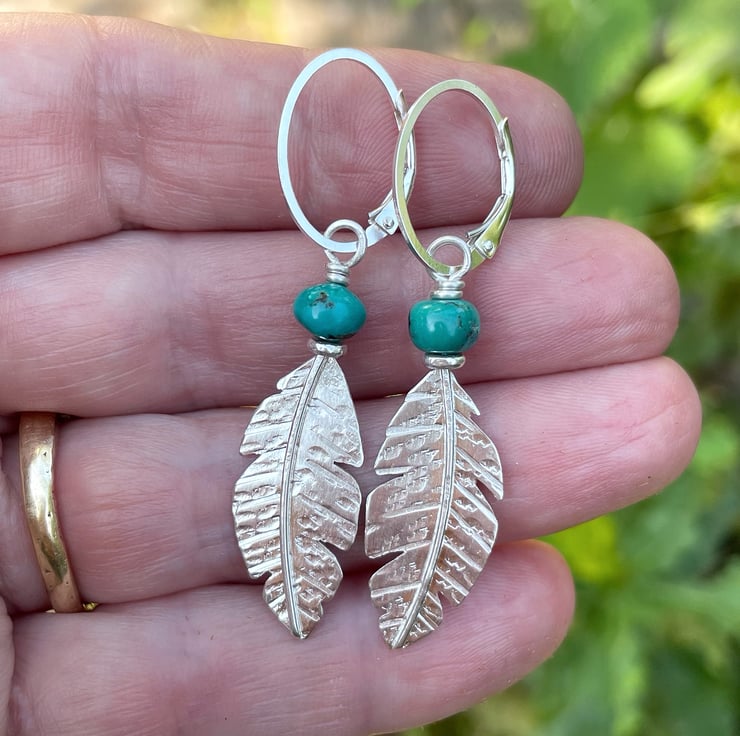 Handmade silver feathers are topped with gorgeous hand cut turquoise beads to make these earring dangles.