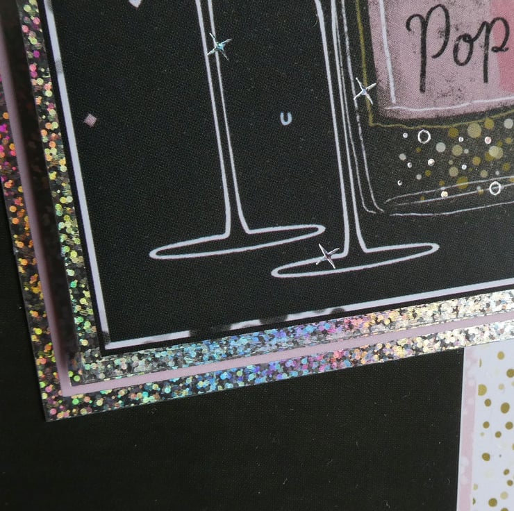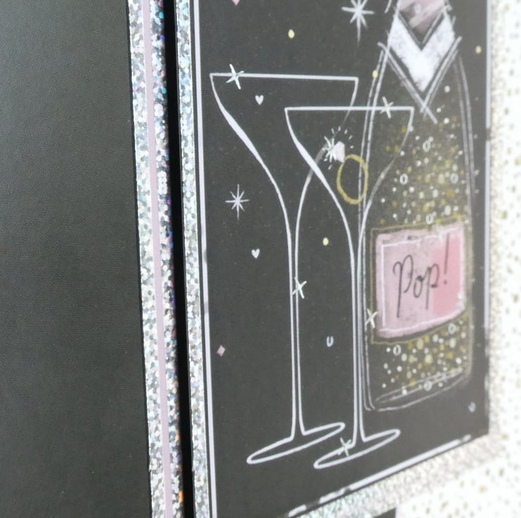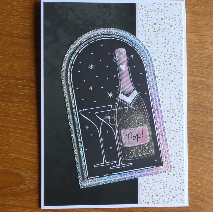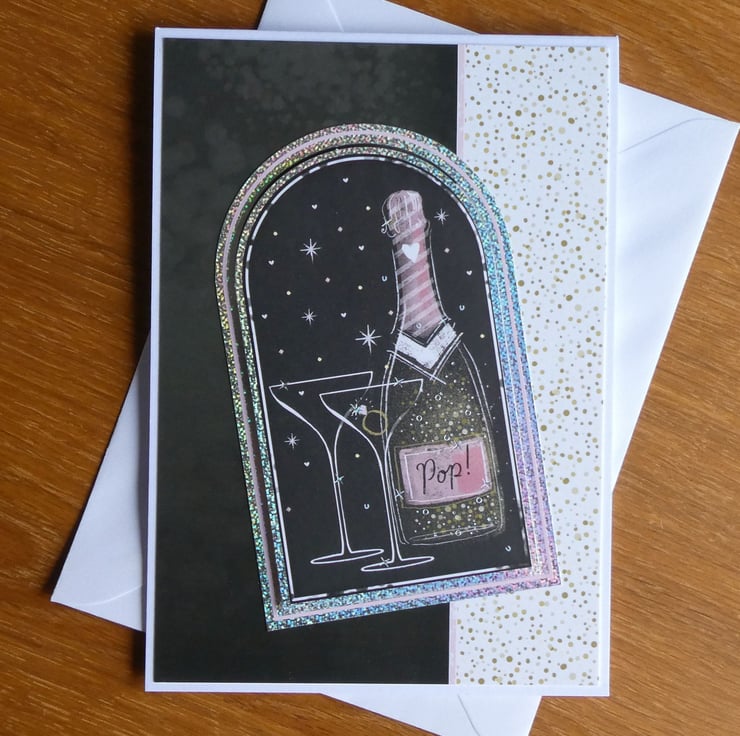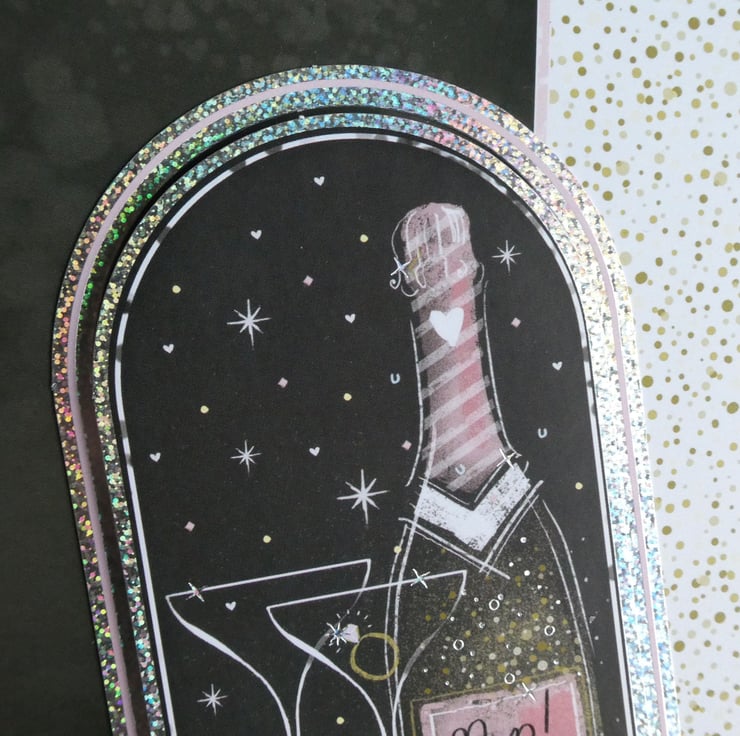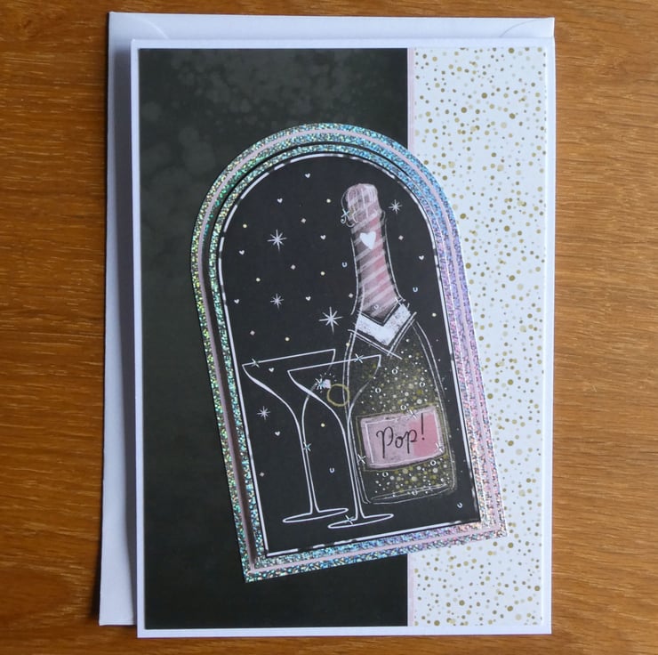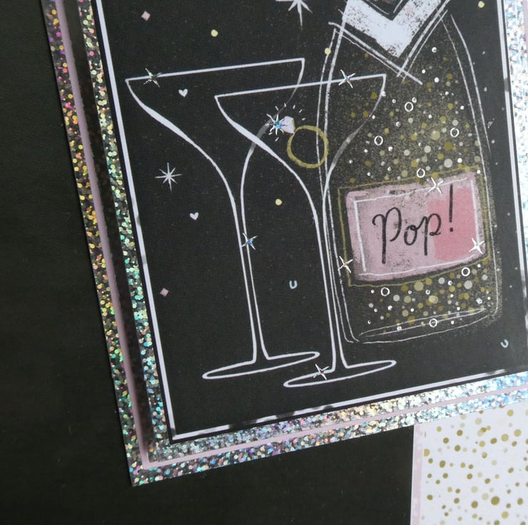 The card has a topper showing a bottle of champagne next to two glasses, one with a sparkling engagement ring inside, printed on quality gloss card in shades of pink, white, grey and black. Surrounding the image are stars, hearts and horseshoes in white and foiled silver.