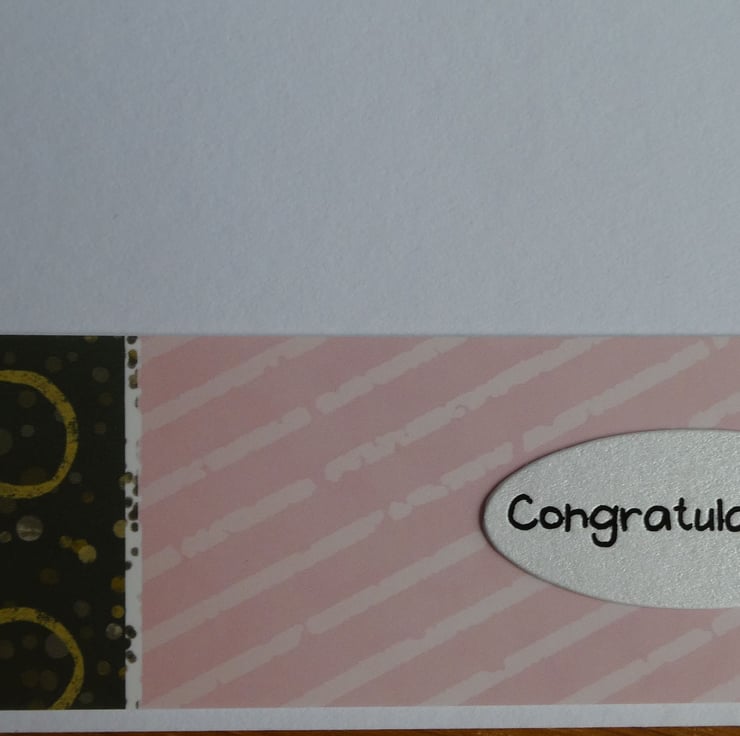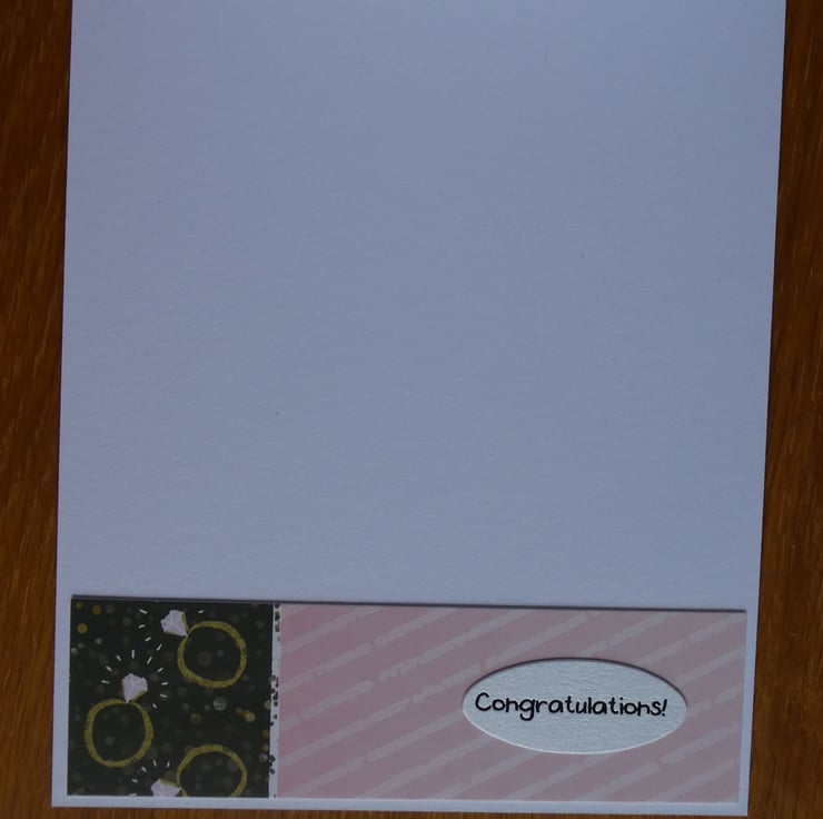 Along the bottom of the inside of the card is a band of toning card with pink stripes and engagement rings and the message 'Congratulations!'.