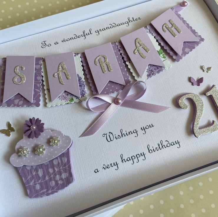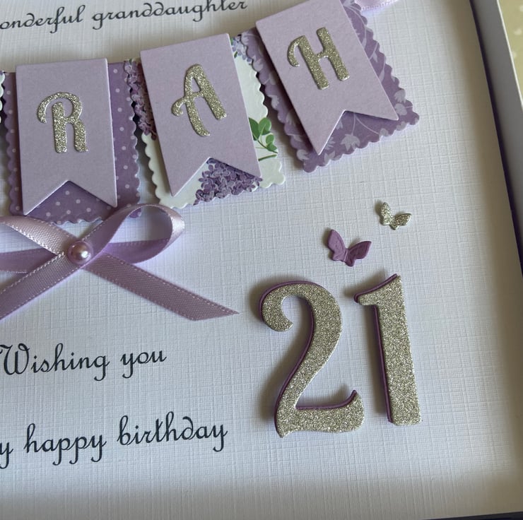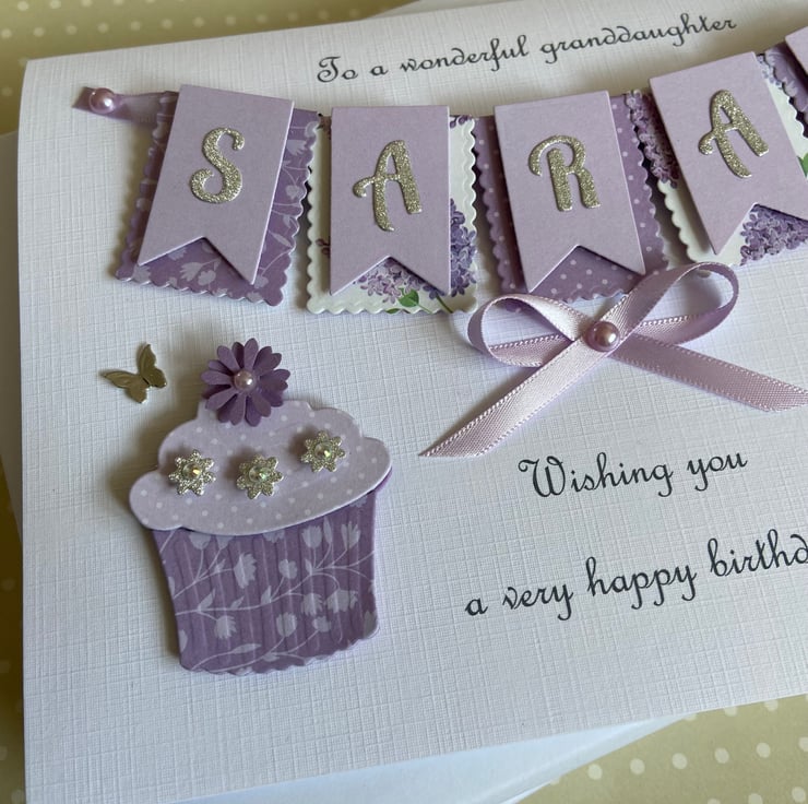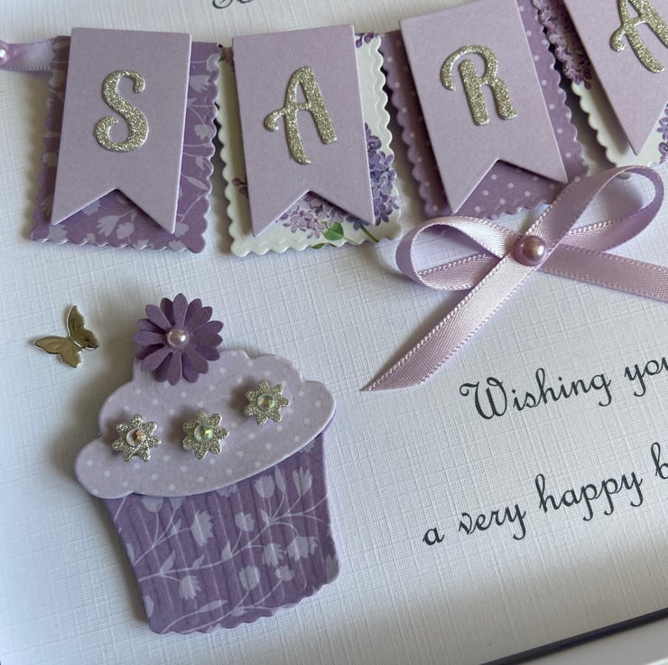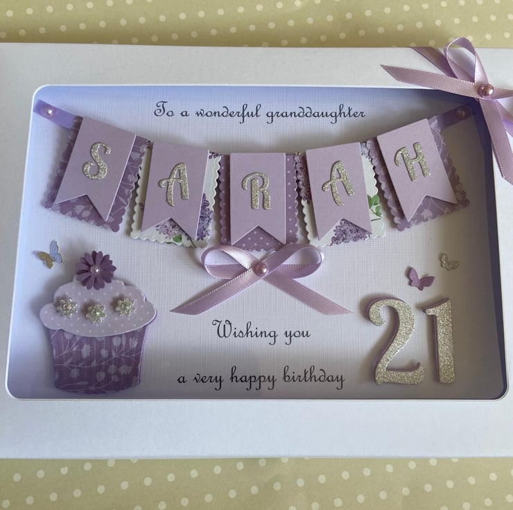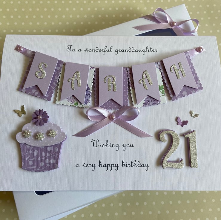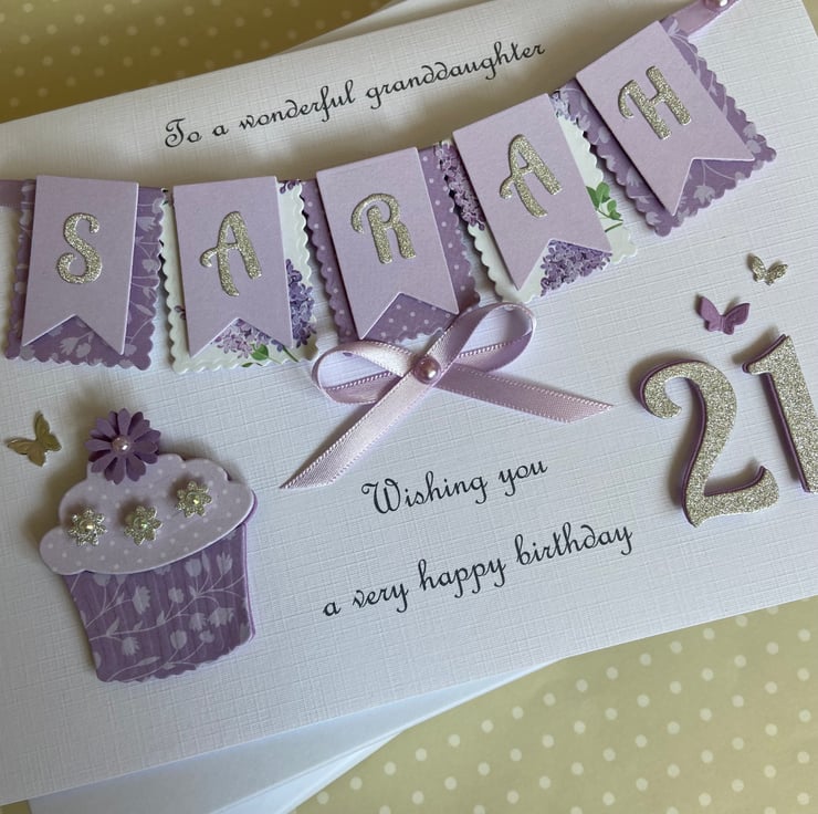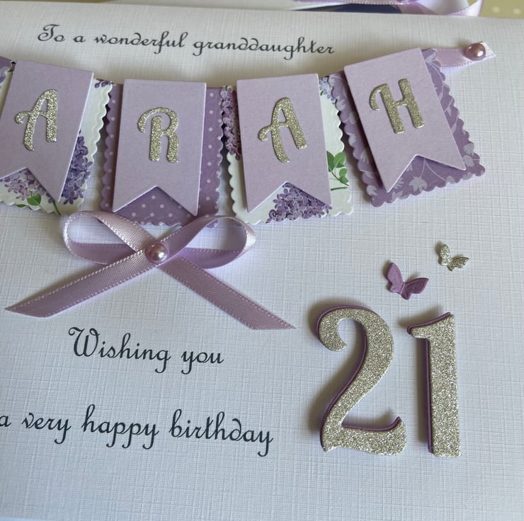 This handmade personalised card is A5 in size ( 210mm x 150mm) and is on 300gsm heavyweight linen cardstock. A name of up to seven letters can be made on the bunting. Any text can be added above and below the bunting. Any age can be put on the card.