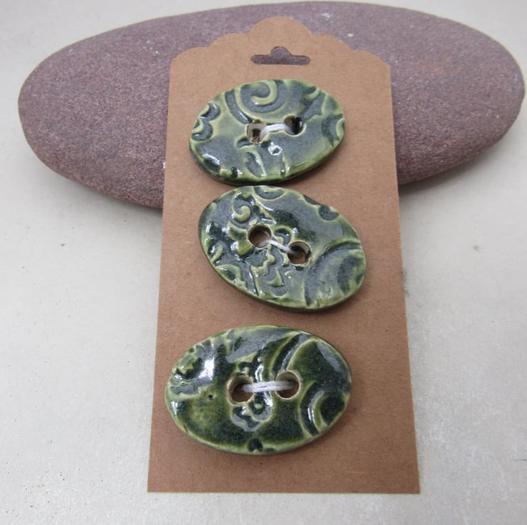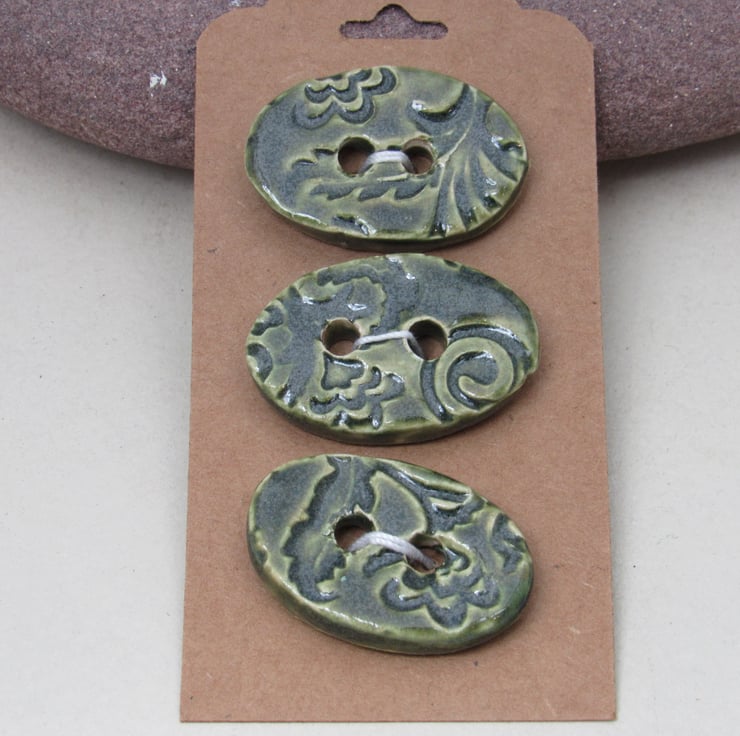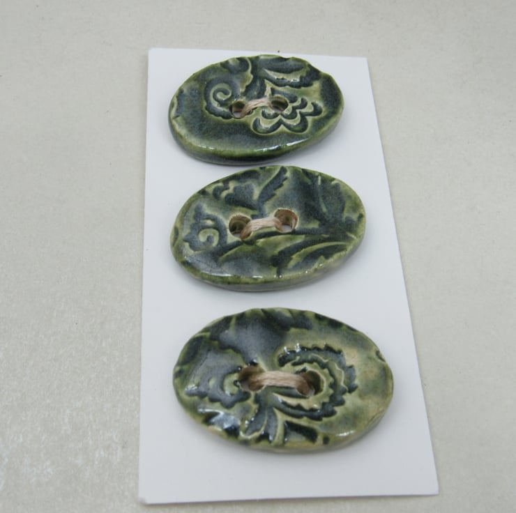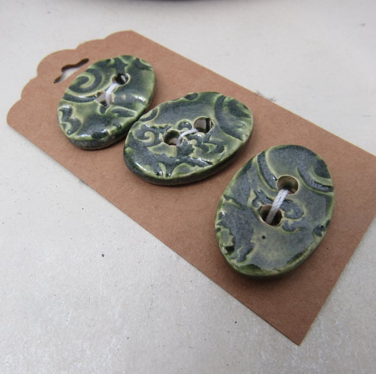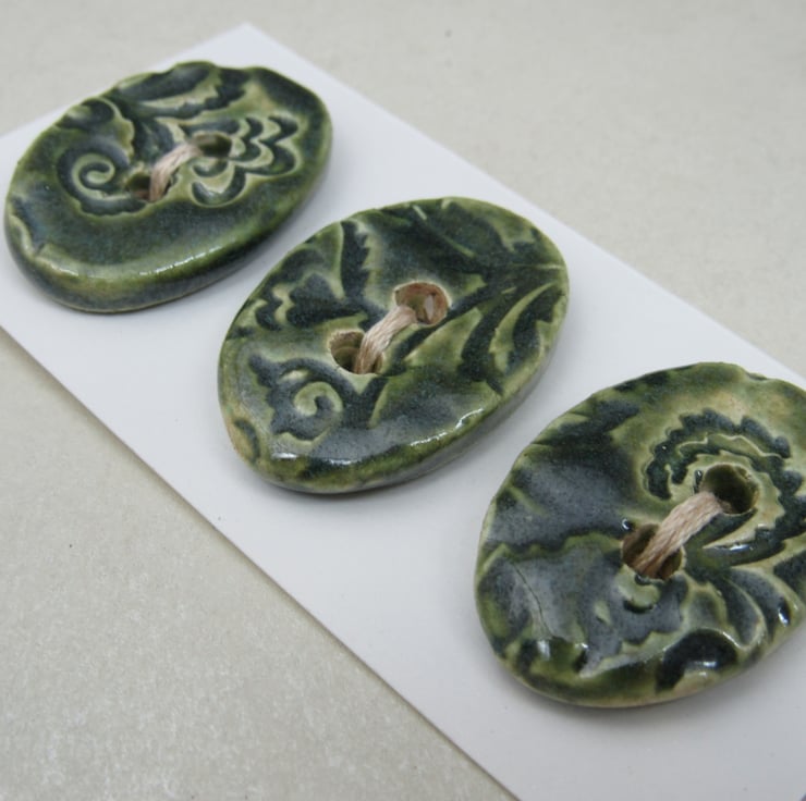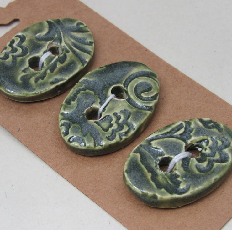 3 medium sized stoneware buttons, with a pretty brocade motif printed into the upper face. Finished with a light forest green glaze.