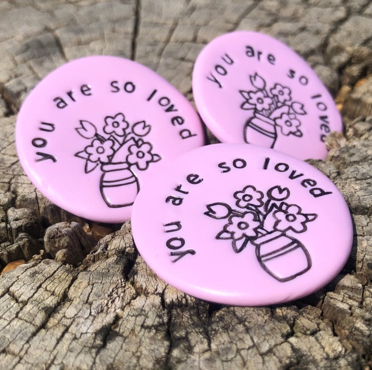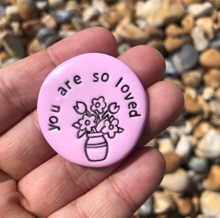 As a primary school art teacher, I know that words have the power to build and encourage and I get to see the joy of word spoken light up a little face. I started making these polymer pebbles as flower designs on cards, but was quickly asked to make these as pebbles that could be held and treasured. Words were then added to produce the designs you see before you.