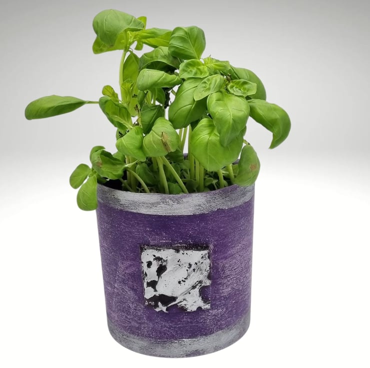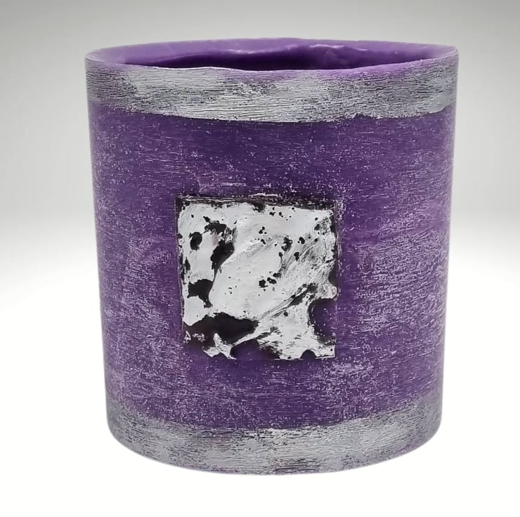 A cylinder shaped plant pot holder made from purple wax with aged effect silver decoration. The container can also be used as a vase or general purpose container for craft tools or pot pourri plus many other uses.