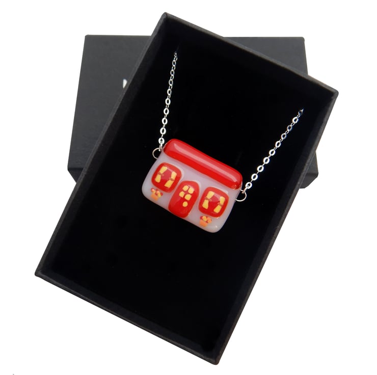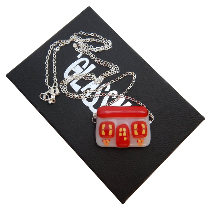 Handmade fused glass 'Cottage' pendant. Supplied with a solid '925' Sterling Silver 18.5" (Princess) chain, and is packaged in a black & silver GLASSMAD presentation box.