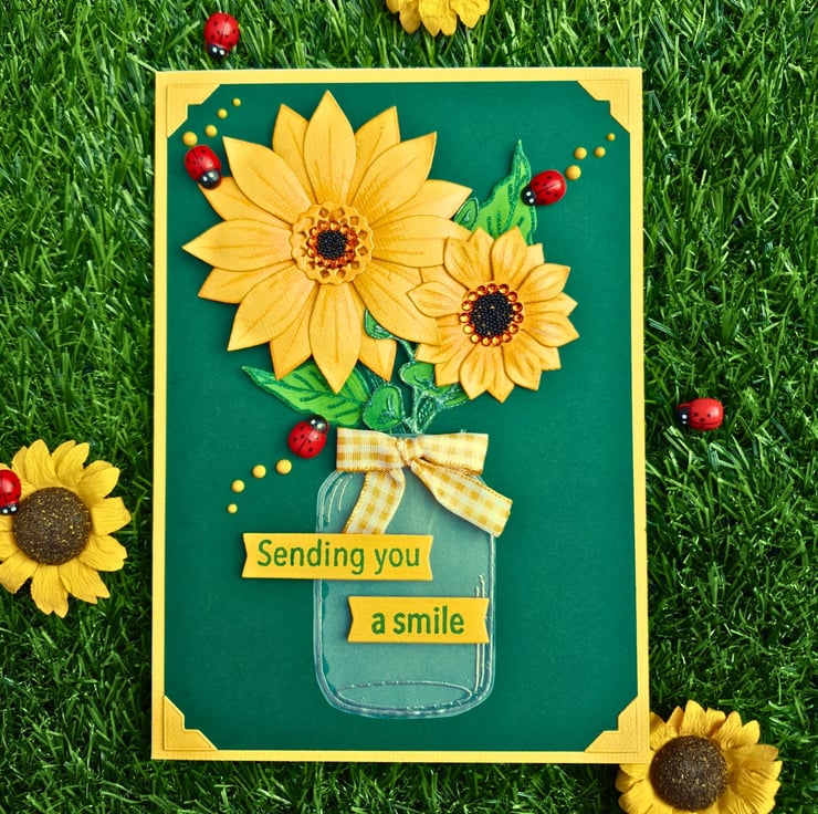 Sunflowers symbolise happiness. so what a better way to brighten someone's day with this handmade greeting card, featuring a jar of bright yellow sunflowers!