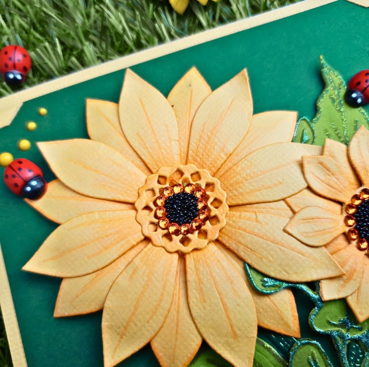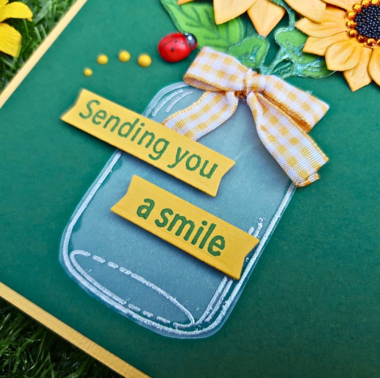 The card consists of white card base, layered with yellow & green panels of quality card. The jar is cut out of vellum, heat embossed with metallic silver & tied with a cheerful yellow & white gingham ribbon, to add charm! The two sunflowers lay on green leaves & are made with 2 layers of bright yellow petals, that have been hand-shaped & coloured to give a 3D, realistic effect. The centres are embellished with craft beads & orange gems. 3 small, playful ladybirds enhance the overall design, followed by yellow coloured dots.