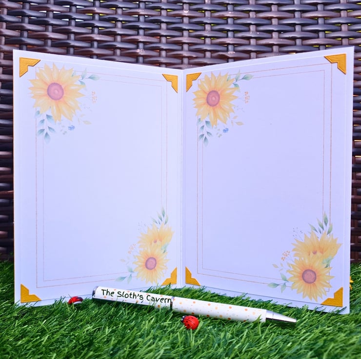The card is finished with 2 panels of coordinating inserts, blank for your own personal message & wishes. Both the front & the inside of the card are framed with yellow decorative photo corners, for a unique finish!