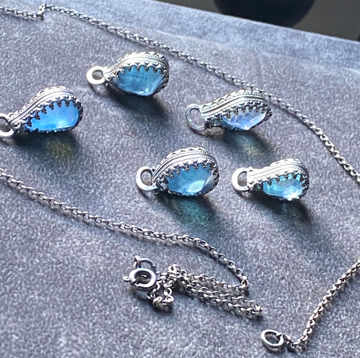 I acquired this collection of 5 faceted Aquamarine gemstones and knew I wanted to mount them in a collar of silver so when the light shines through them you can see the beautiful colour.