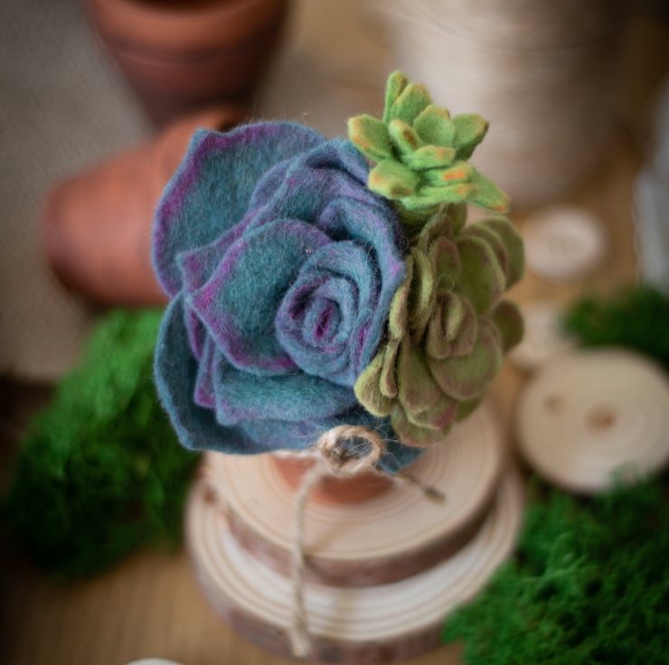 Succulents are hand cut and assembled with hot glue, wire and stabilized moss. Soft pastels are used to add colours to the leaves.