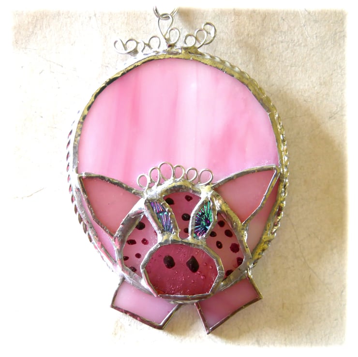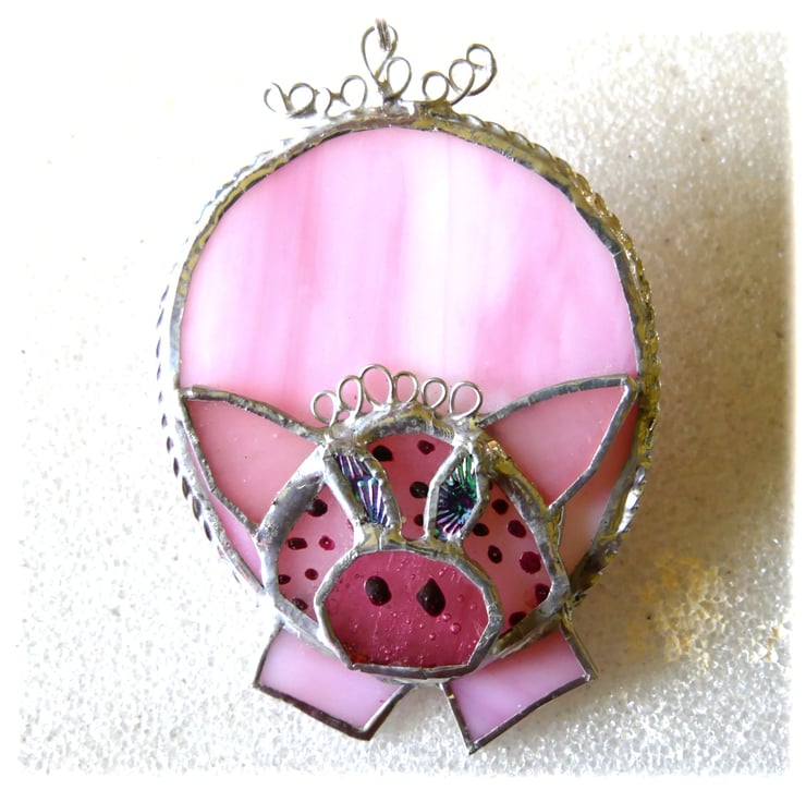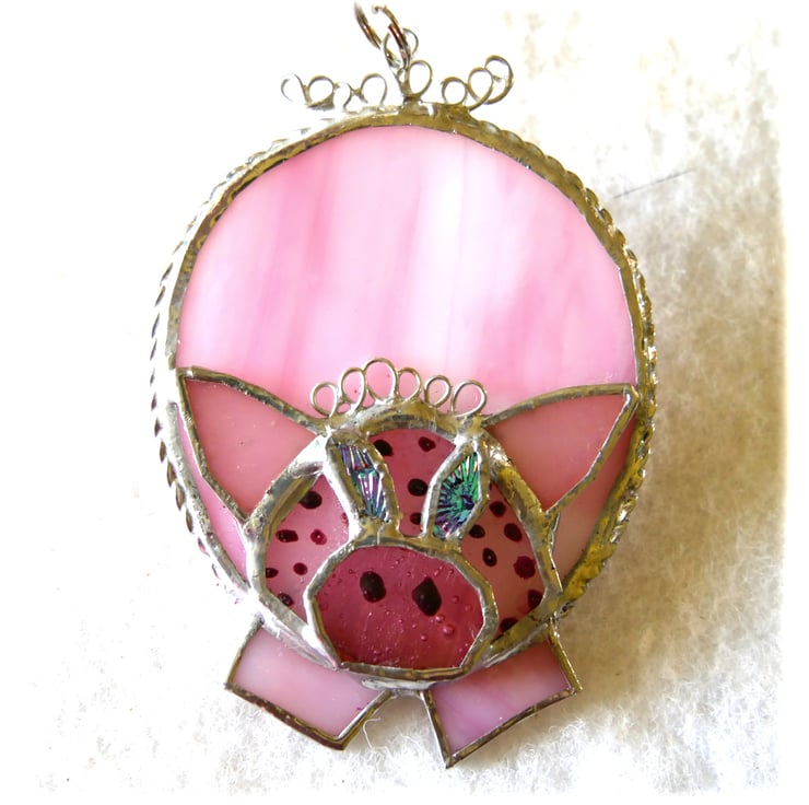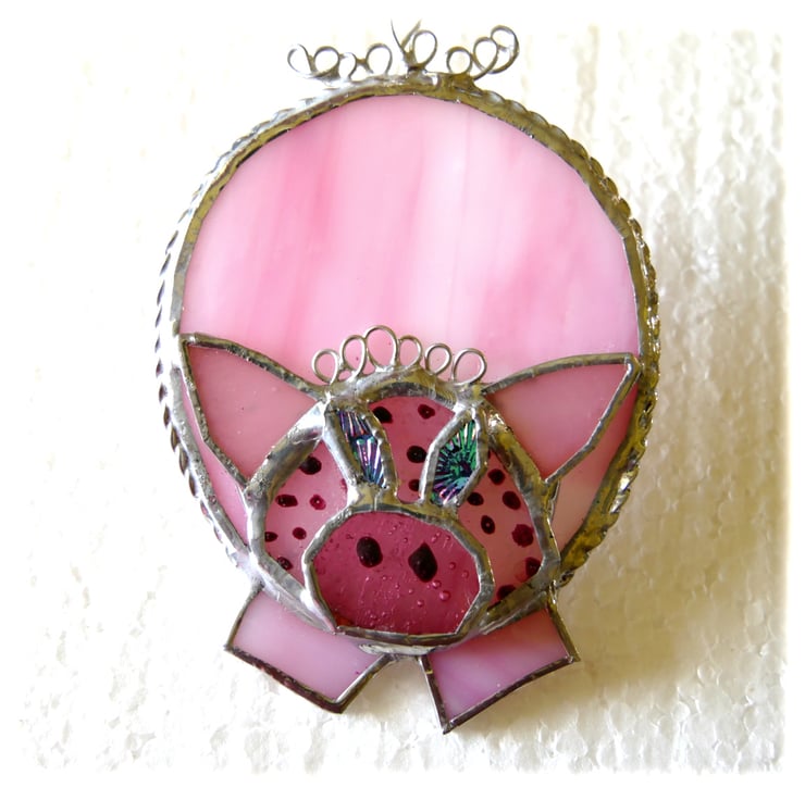 The pig is made entirely from pink glass with lots of streaks and is in 3 layers with the face and ears soldered on top of the body and then the snout and eyes onto the face.