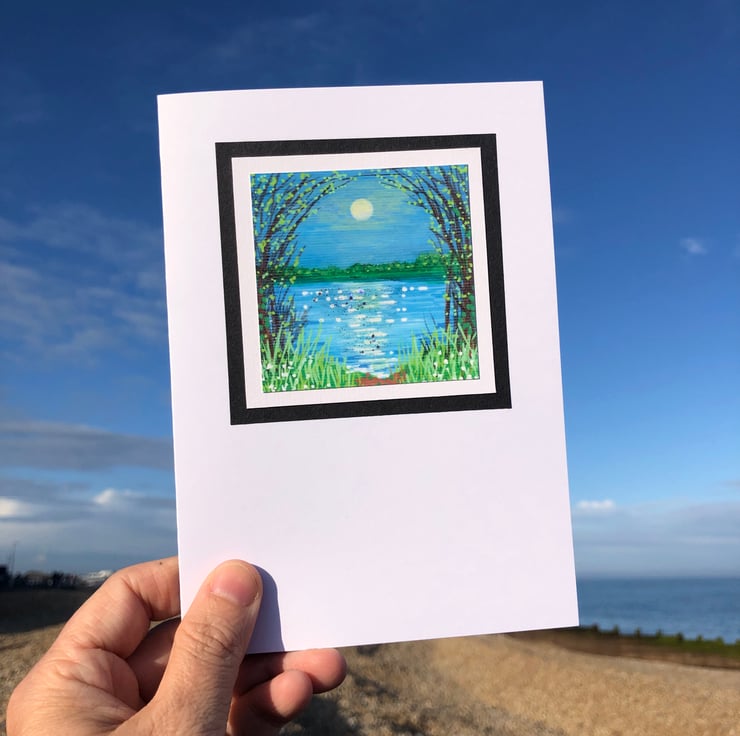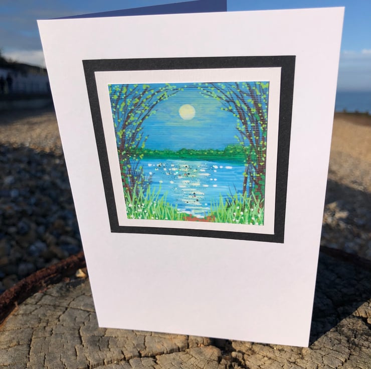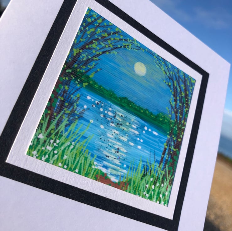 This vibrant card is a print of an acrylic and pen miniature artwork and is double mounted on white premium card, then black, to give the design a beautiful framed perspective, which make the colours pop. A glitter effect has been painted on to the print to give it an extra sparkle.