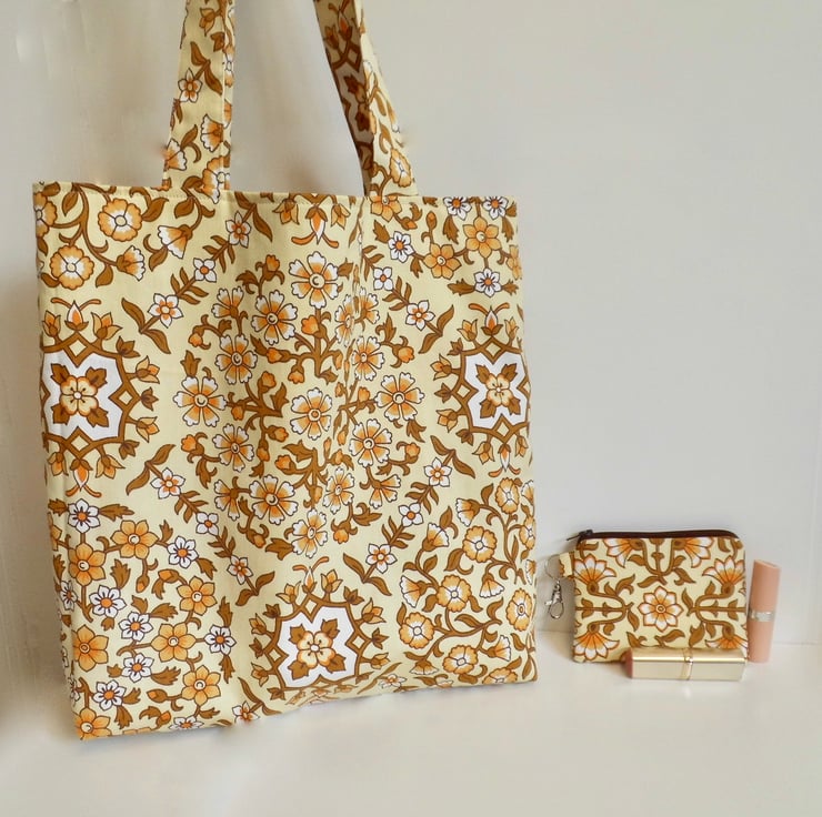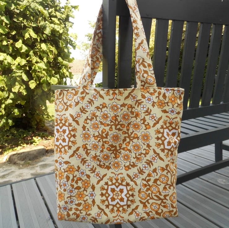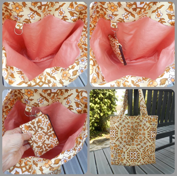 The fabric used for this tote bag and matching purse is genuine vintage mid-weight cotton. It is reclaimed, I think it had a previous life as a curtain and is in very good condition. An orange and brown print on a cream background, very 1970s.