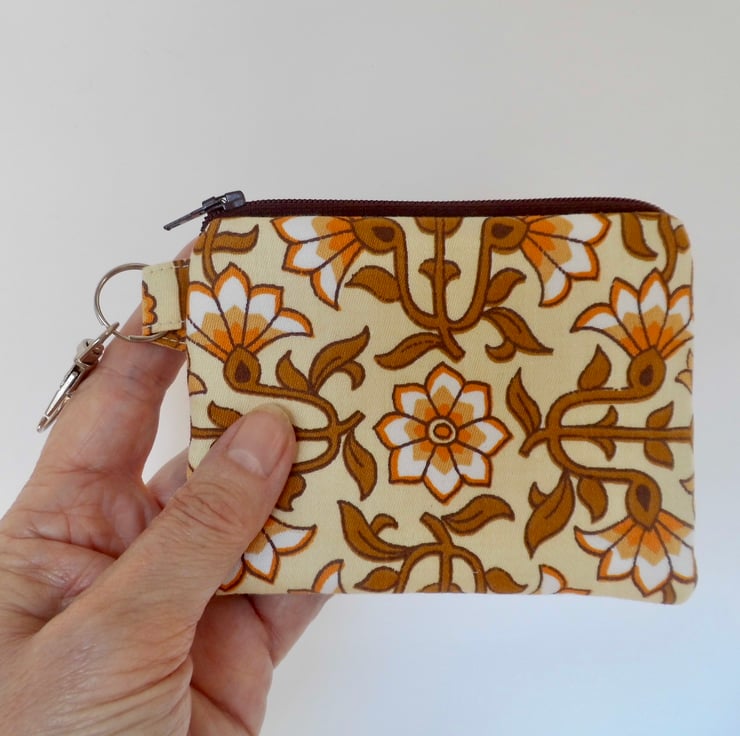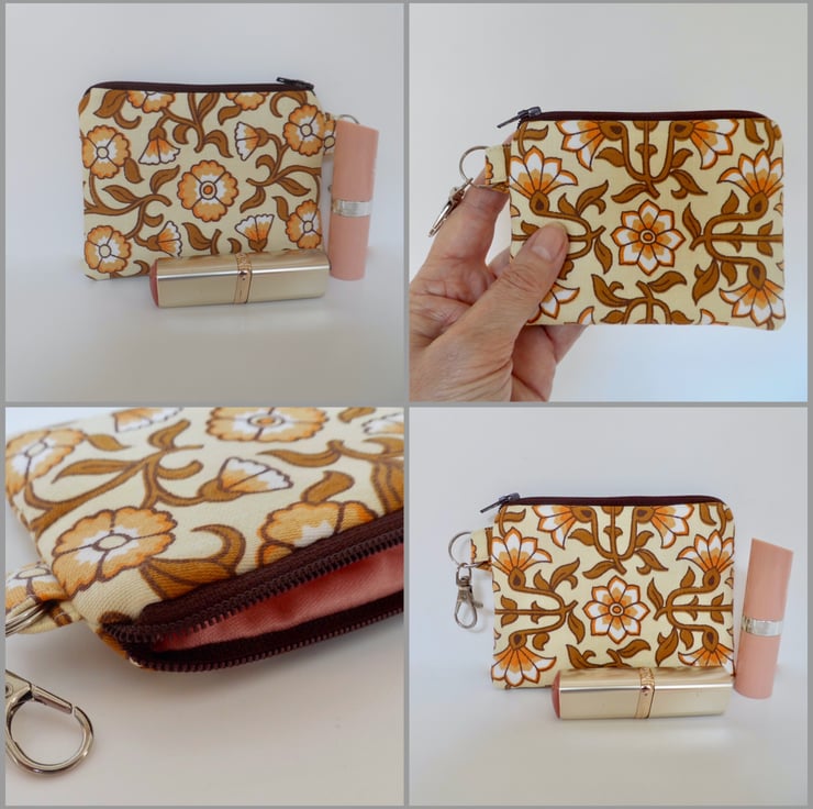 The purse is made with the same fabric, which I backed with fusible fleece for padding. It is lined with peach cotton fabric, has a dark brown zip across the top and a key ring loop complete with clasp at the side. It measures 13cm x 9cm and could hold coins, cards, or other small items.