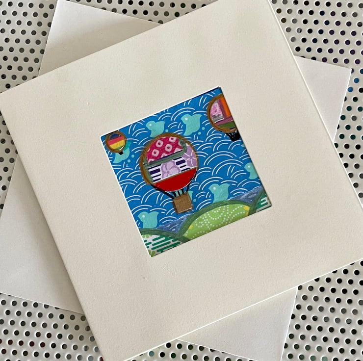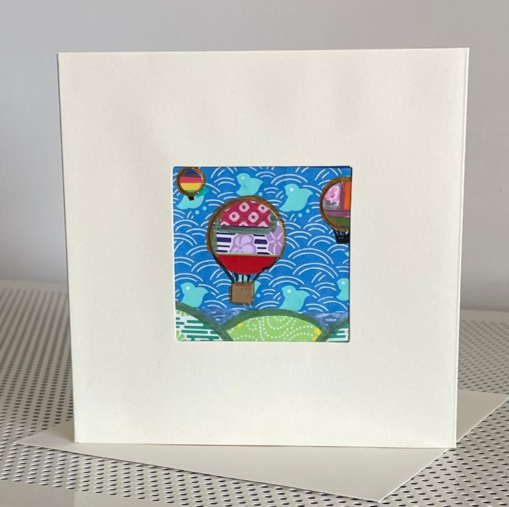 The card motif is a hand pieced collage depicting hot air balloons over the rolling Somerset hills.
