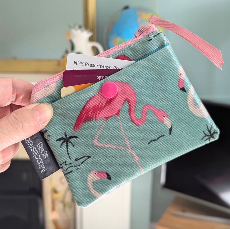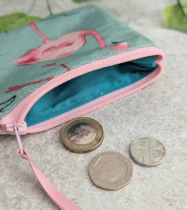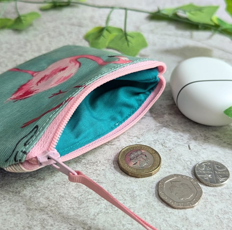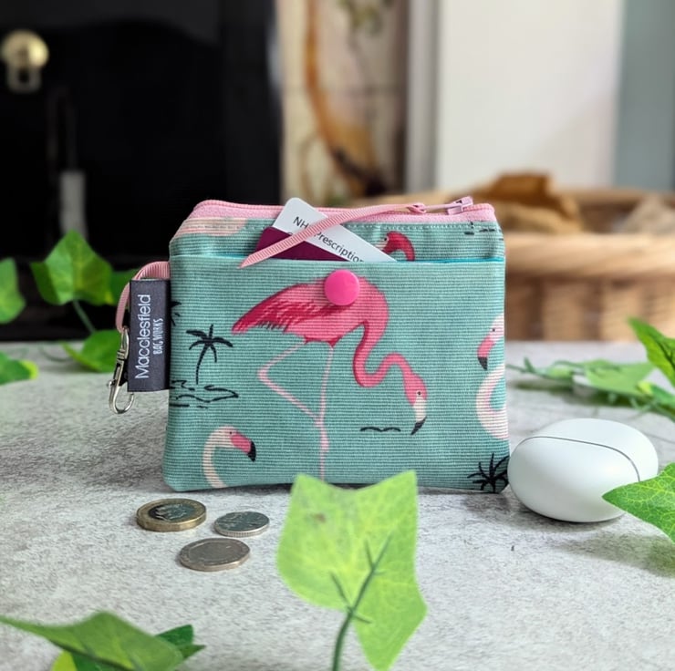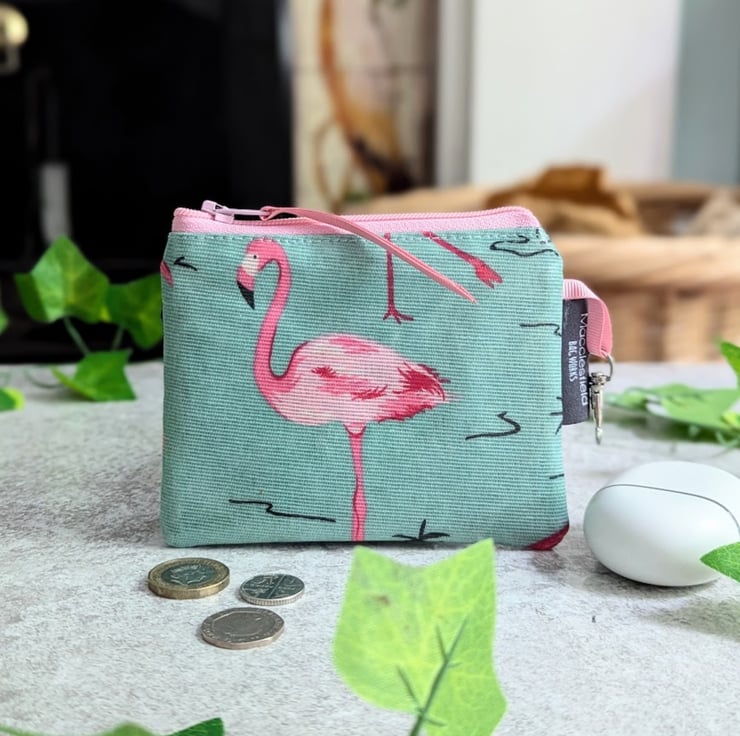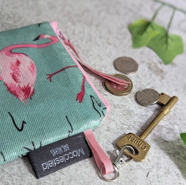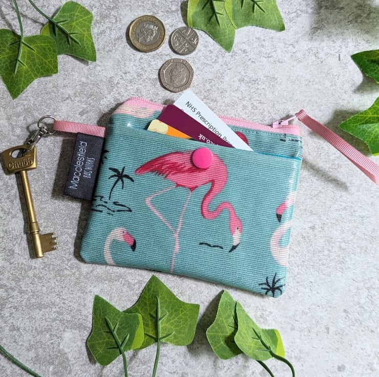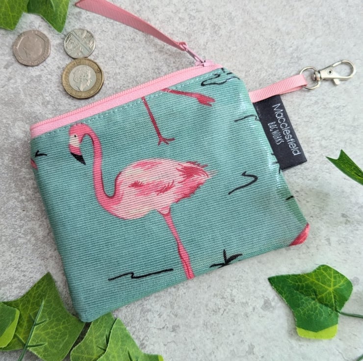 A quirky little pink and eau de-nil blue oilcloth coin and card purse. A retro flamingo design adorns the front and back of the purse giving it a quirky, bright and cheery look.