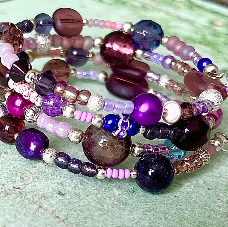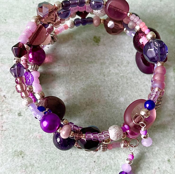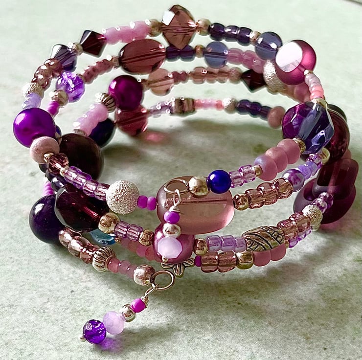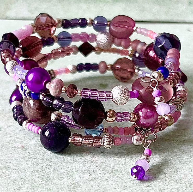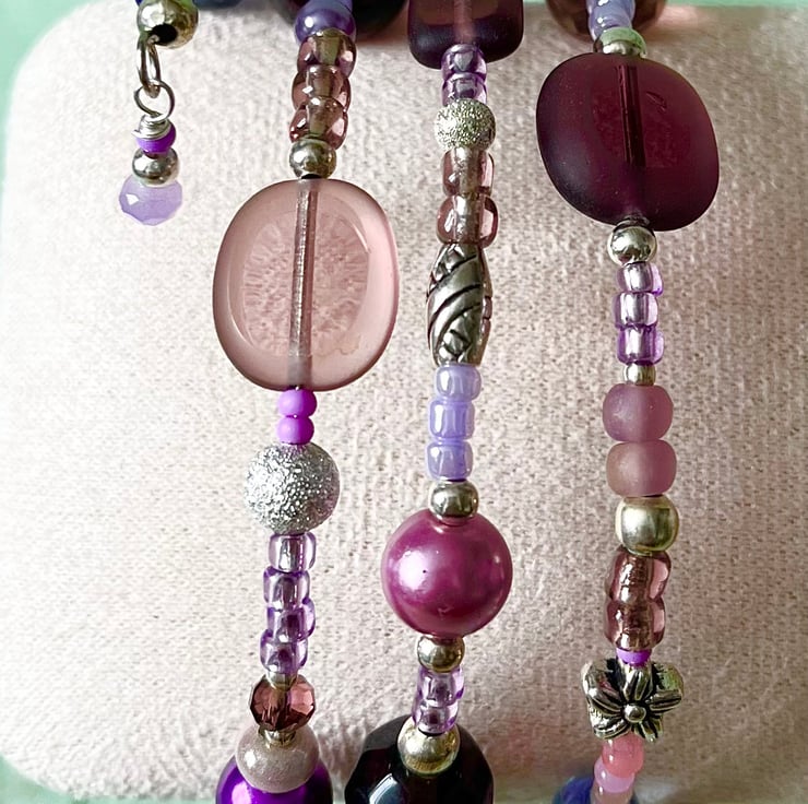 It has a mix of gemstone & glass beads in purples and pinks, in different shapes and sizes, interspaced with smaller metal spacer beads and glass seed beads.