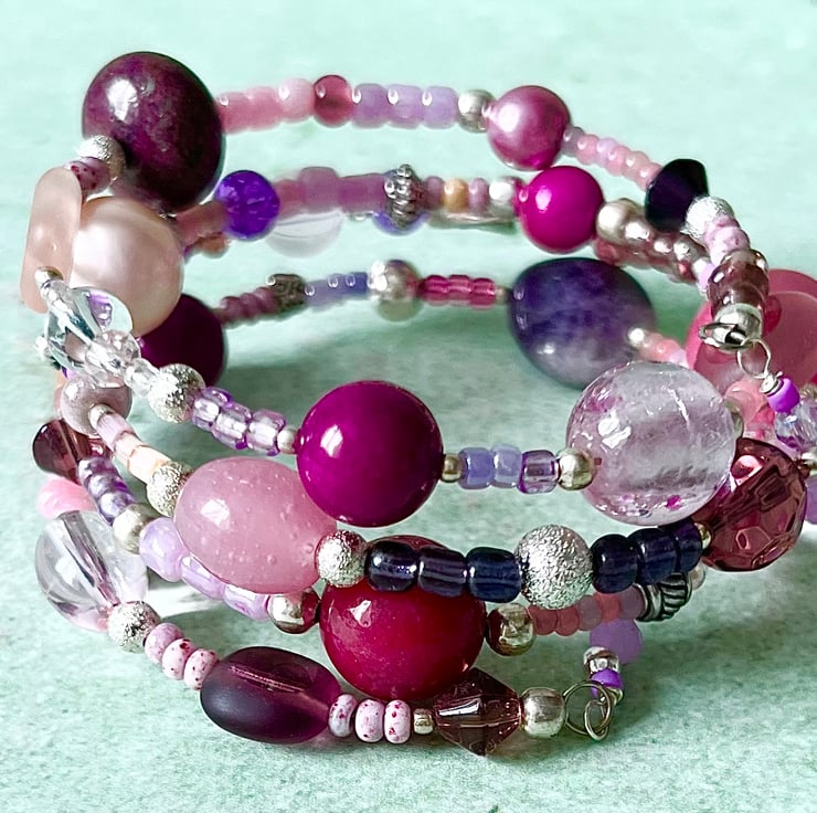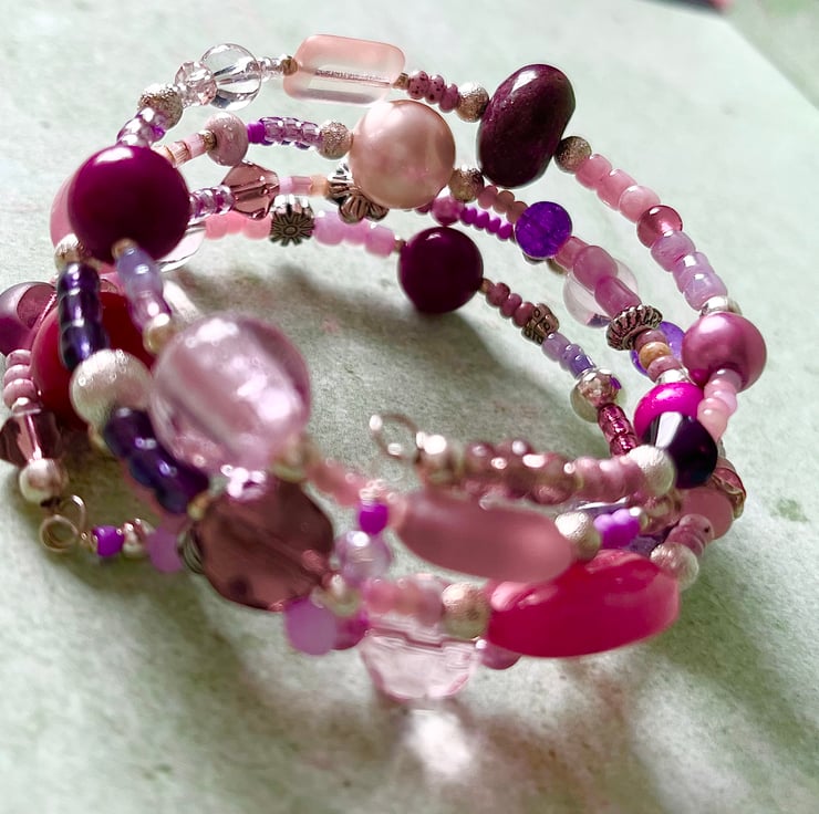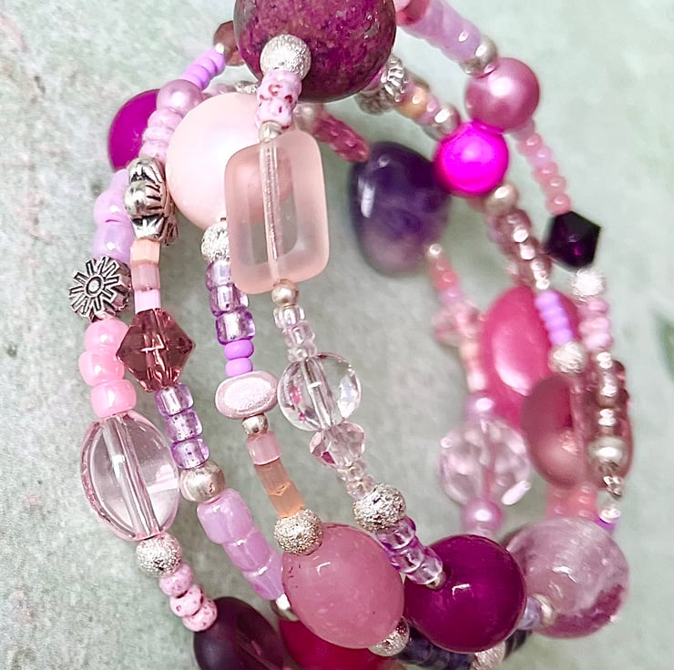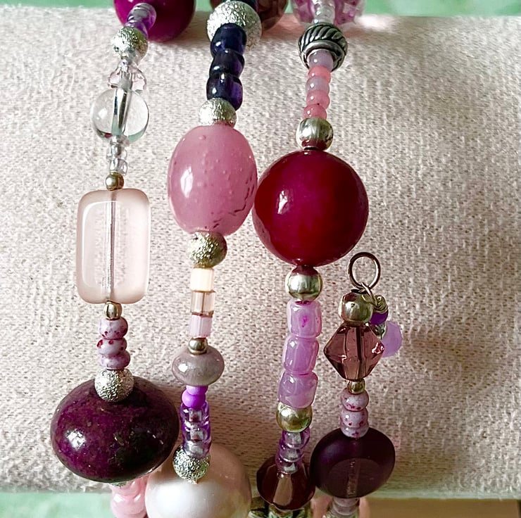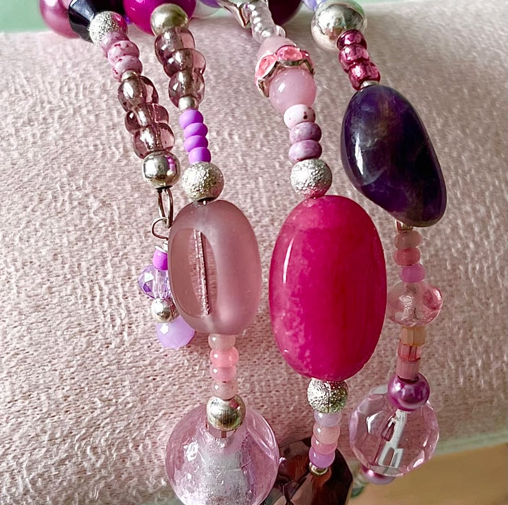 It has a mix of gemstone & glass beads in purples and pinks, in different shapes and sizes, interspaced with smaller metal spacer beads and glass seed beads.