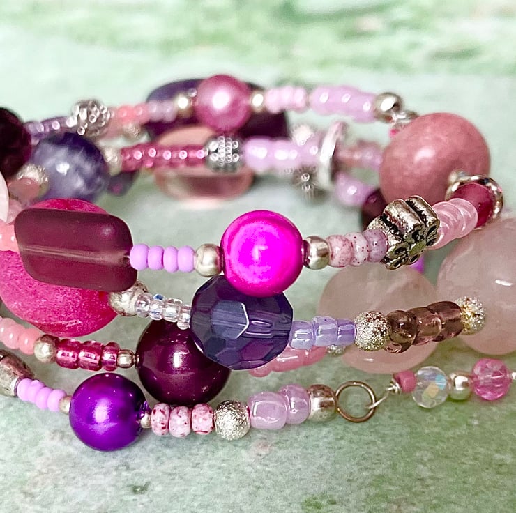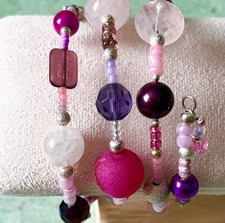It has a mix of gemstone & glass beads in purples and pinks, in different shapes and sizes, interspaced with smaller metal spacer beads and glass seed beads.