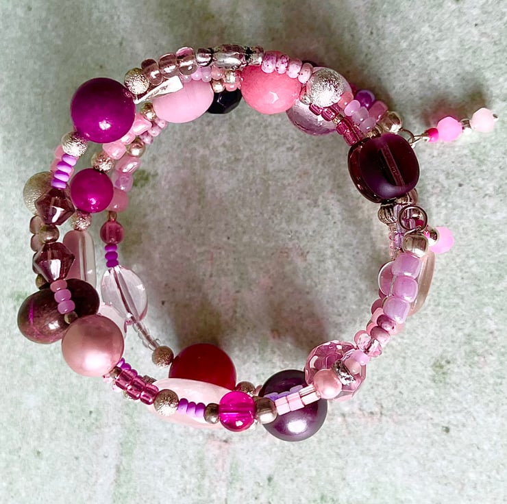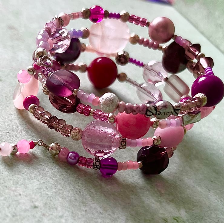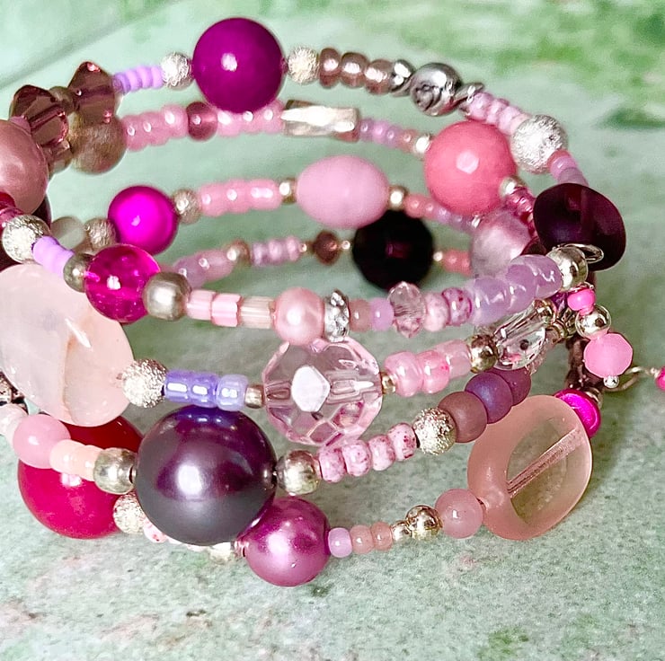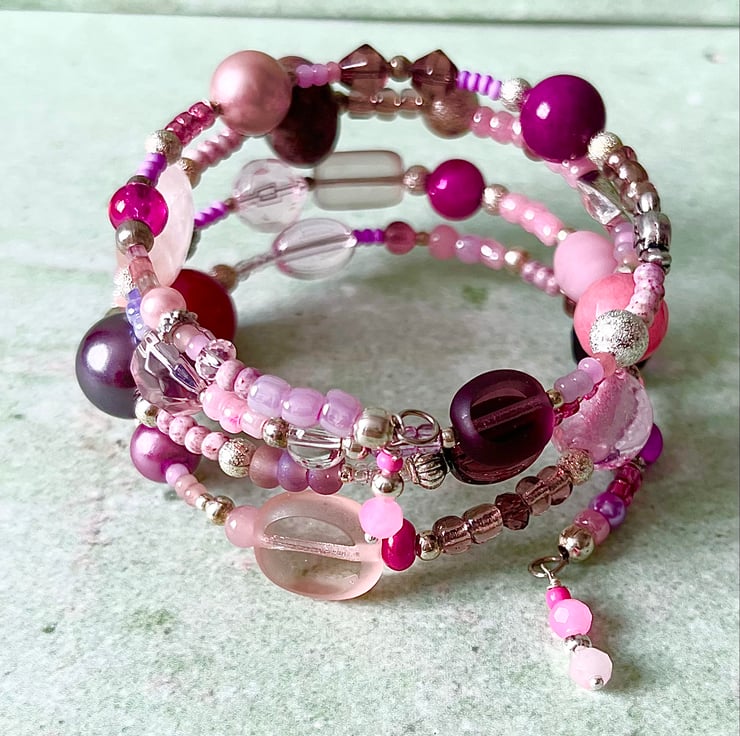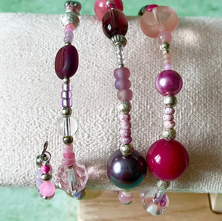 It has a mix of gemstone & glass beads in purples and pinks, in different shapes and sizes, interspaced with smaller metal spacer beads and glass seed beads.