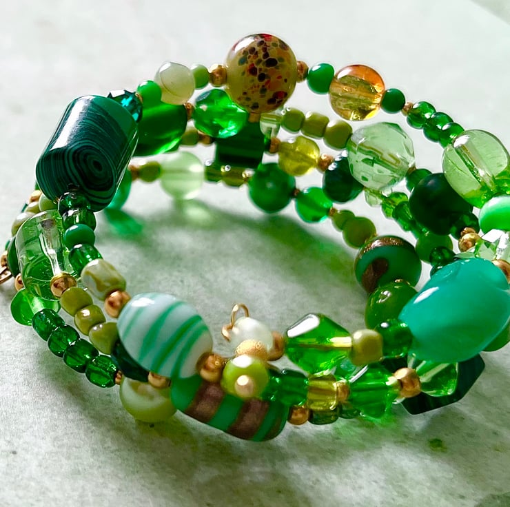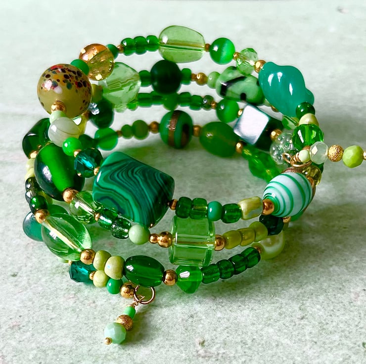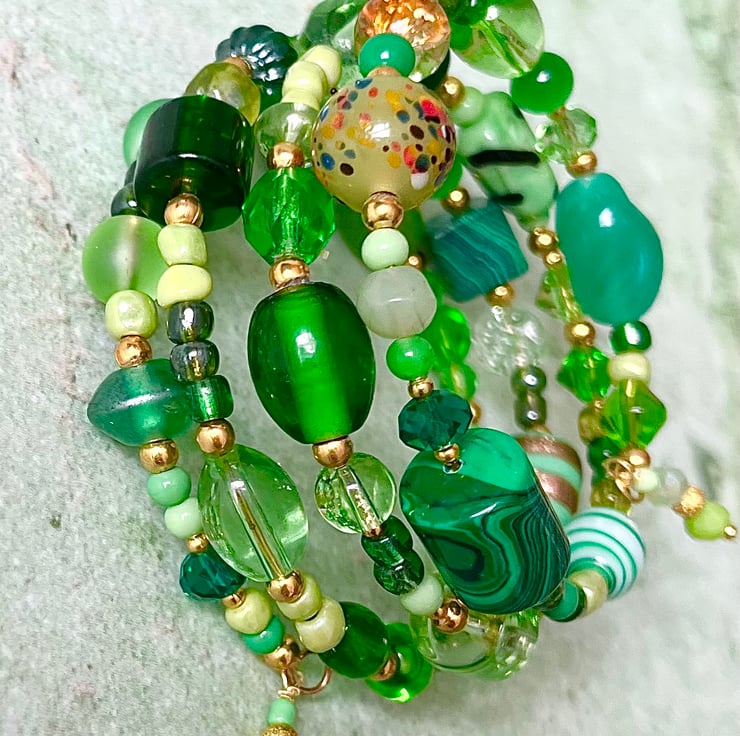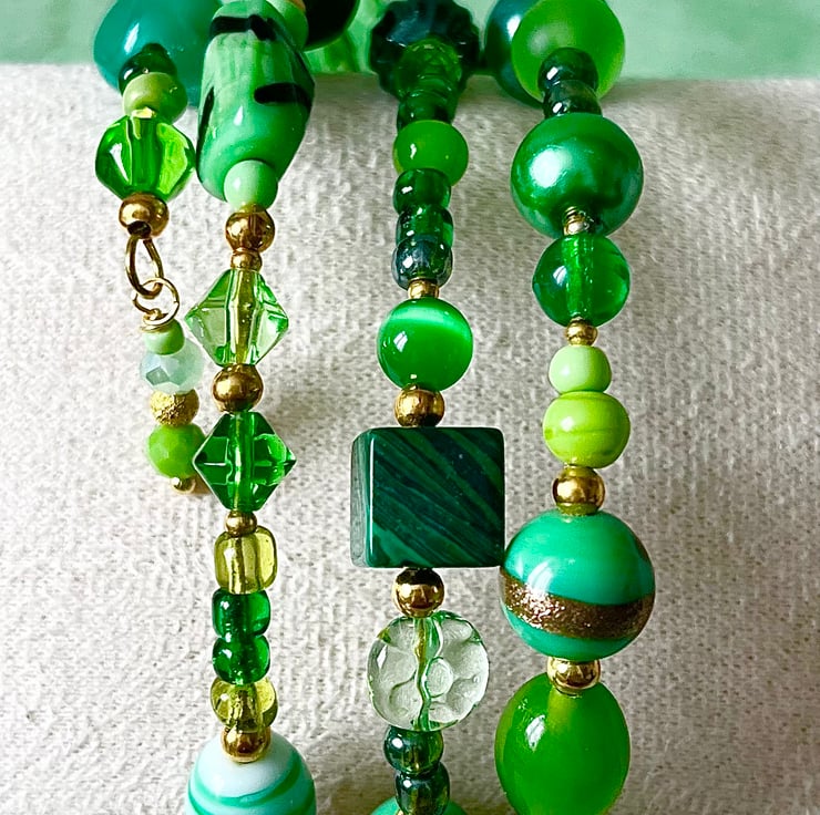 It has a mix of glass beads with a variety of Green shades, in different shapes and sizes, interspaced with smaller gold metal spacer beads and glass seed beads.