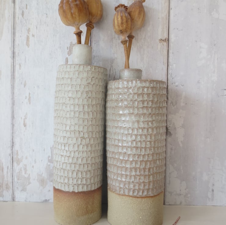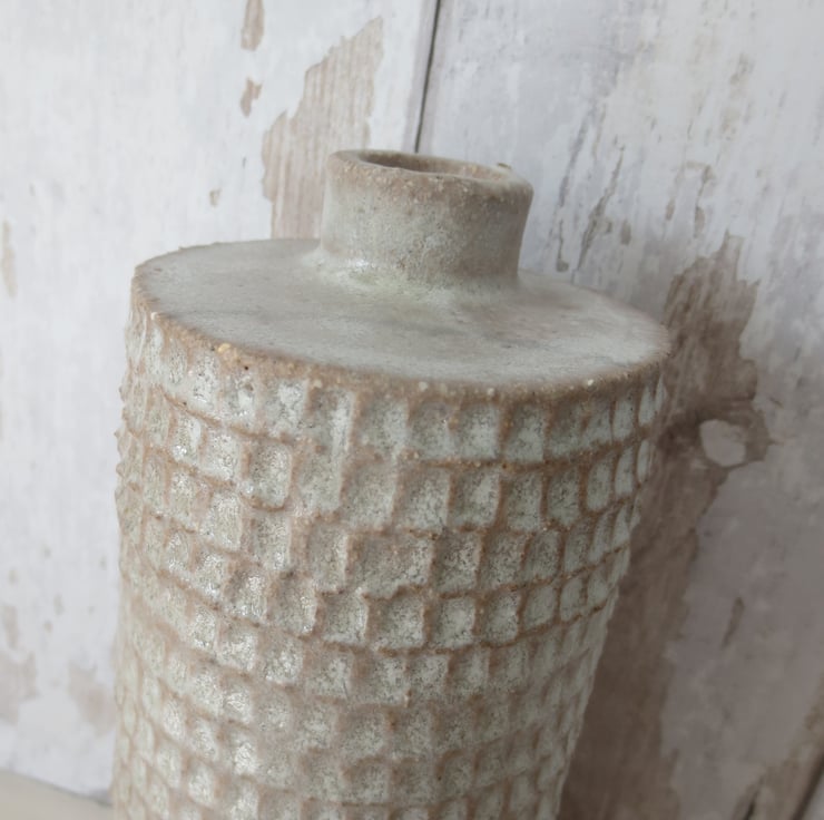 Cylindrical bottle vase hand built from textured, buff coloured crank clay that has been carved for added texture and interest. Fired to stoneware temperature (1280C) with a satin white glaze. Would suit dried flowers, but will hold water.