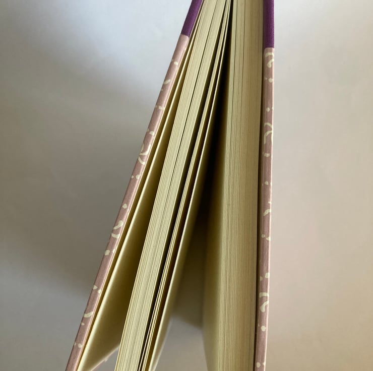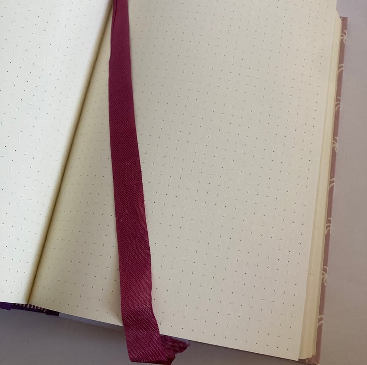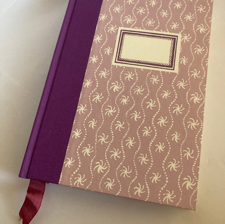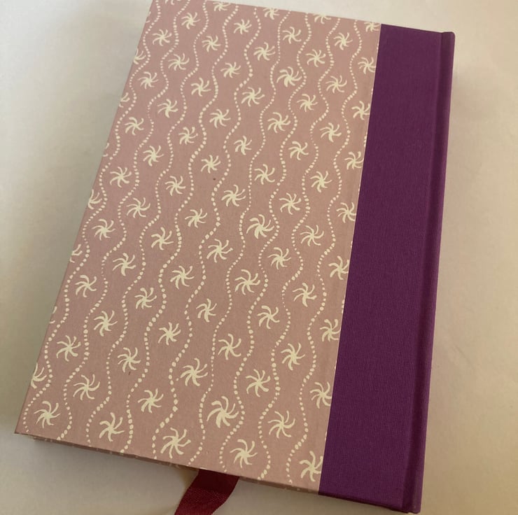 A5 dot print journal, hand bound in a fun starry pattern paper from Cambridge Imprint for the covers, a matching purple bookcloth spine and finished with a vintage style ribbon marker.